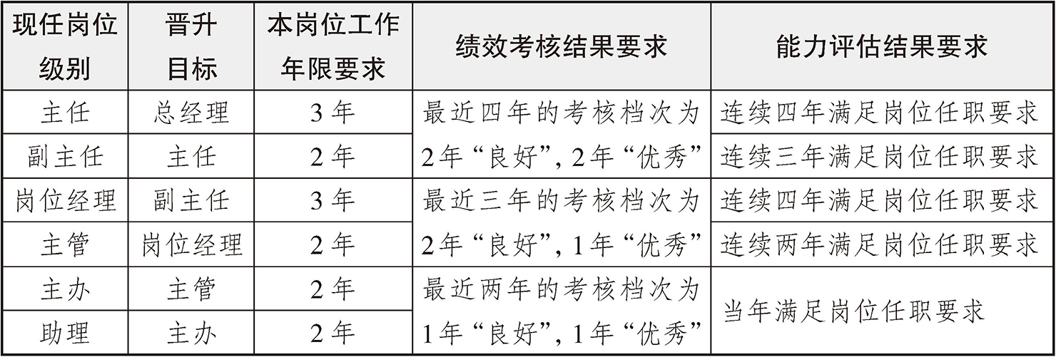 员工的职位等级应能上能下,保证公平竞争。职位体系的每一个序列都对应一种职业发展路径,各种路径有各自的晋升空间,并且在责任、报酬、影响力方面都具有可比性。各类员工按照考核结果和实际工作需要进行岗位的晋升或降低,晋升条件可参考表3-2。