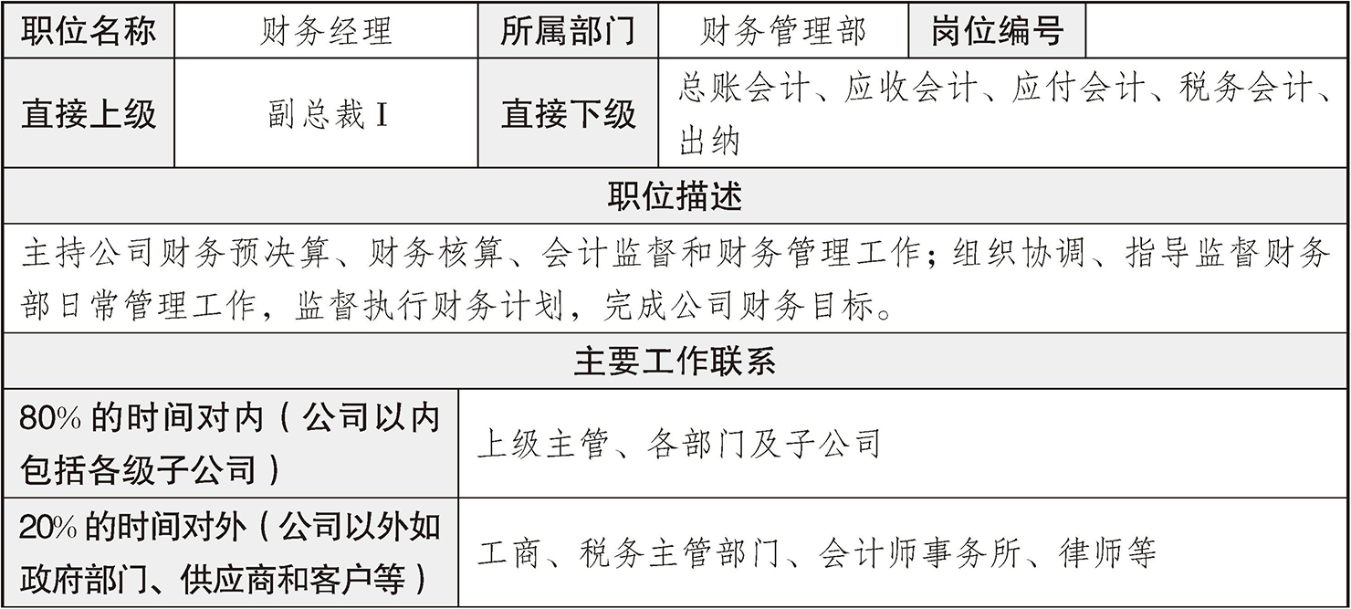 (4)沟通关系。一般分为外部与内部两个层面。例如,人力资源经理的内部沟通有分管副总经理、部门经理与员工;外部沟通有上级主管部门、所在城市人事劳动部门、各主要媒体或招聘网站、各主要培训机构、应聘人员或同行、相关行业协会。