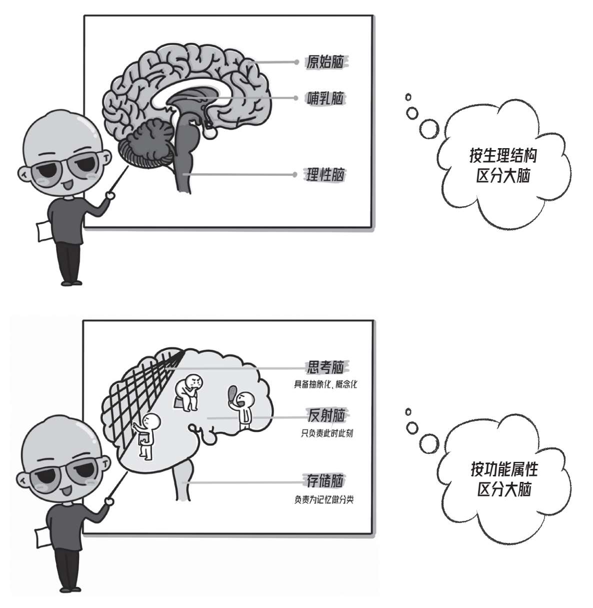 但今天,我想按照功能属性来区分大脑的不同部分。我们可以将其分为三个部分:反射脑、思考脑、存储脑。