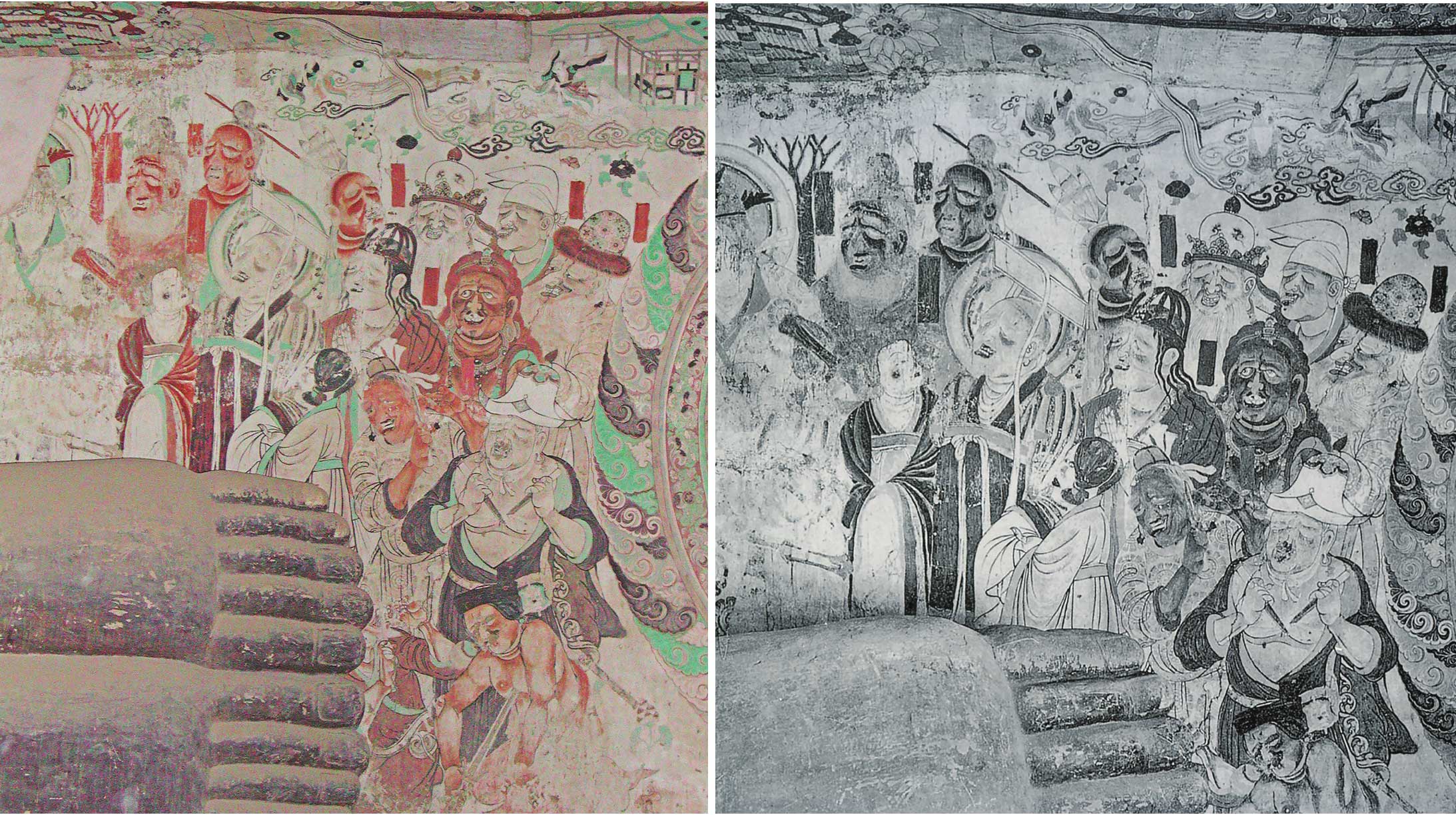 图16 莫高窟中唐第158窟涅槃经变各国王子举哀图(敦煌研究院提供,黑白图片系伯希和考察队1908年拍摄)