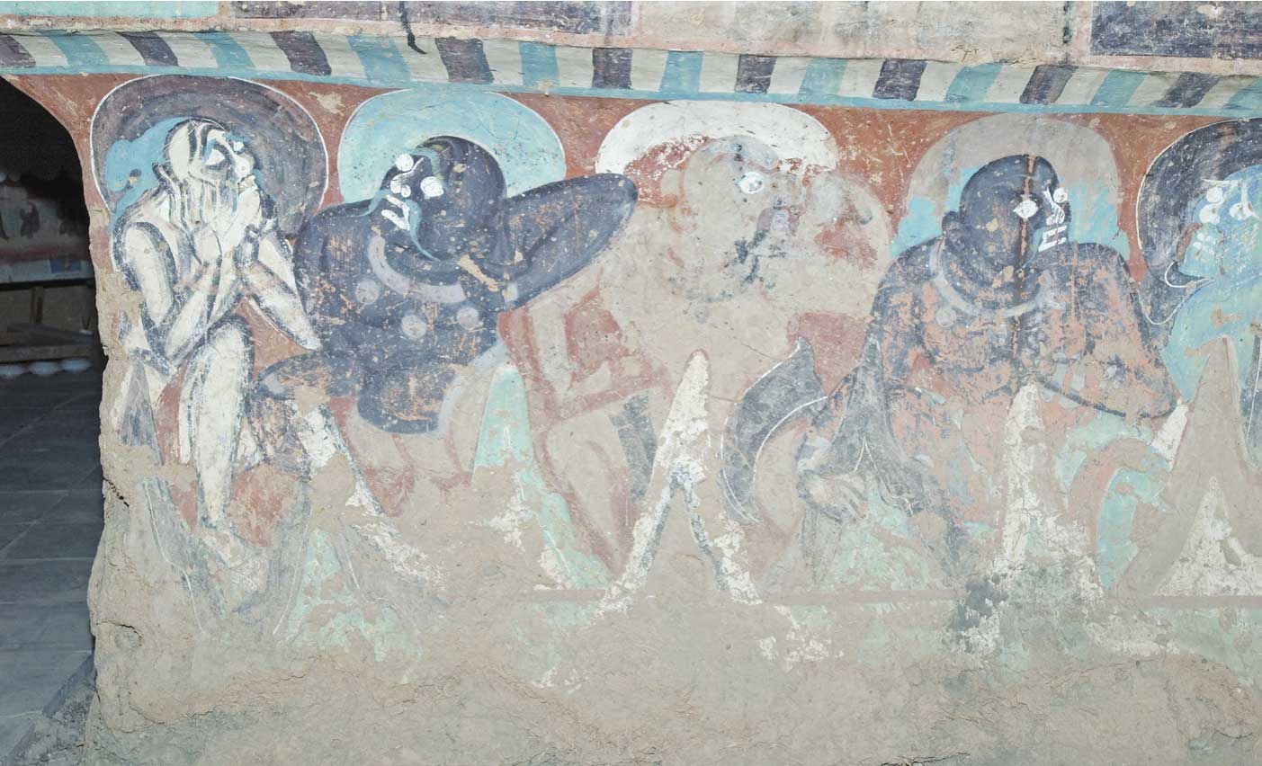 以莫高窟初唐第323窟张骞出使西域图为代表,洞窟艺术中记载或反映丝路的内容颇多,几乎贯穿了敦煌洞窟营建一千余年的历史。像早期壁画中富于西域犍陀罗风格的造像(图15),隋代洞窟中大量出现的各类具有浓厚波斯萨珊风格的联珠纹样,隋唐五代洞窟壁画观音经变中的胡商遇盗图,直接反映丝路交通往来的张骞出使西域图、佛顶尊胜陀罗尼经变佛陀波利求法图,维摩诘经变中大规模出现的各国王子问疾图,涅槃经变中出现的各国王子举哀图(图16),五台山图中大量的交通贸易图像,降魔经变中来自不同民族和国家的士兵形象,其他经变中反映丝路风情的大量图像,如各类音乐、舞蹈、交通、军事、服饰、家具、图案、颜料、技术等等,都是敦煌壁画留给我们今天认识丝路、理解丝路、发展丝路文化的不可多得的珍贵资料。