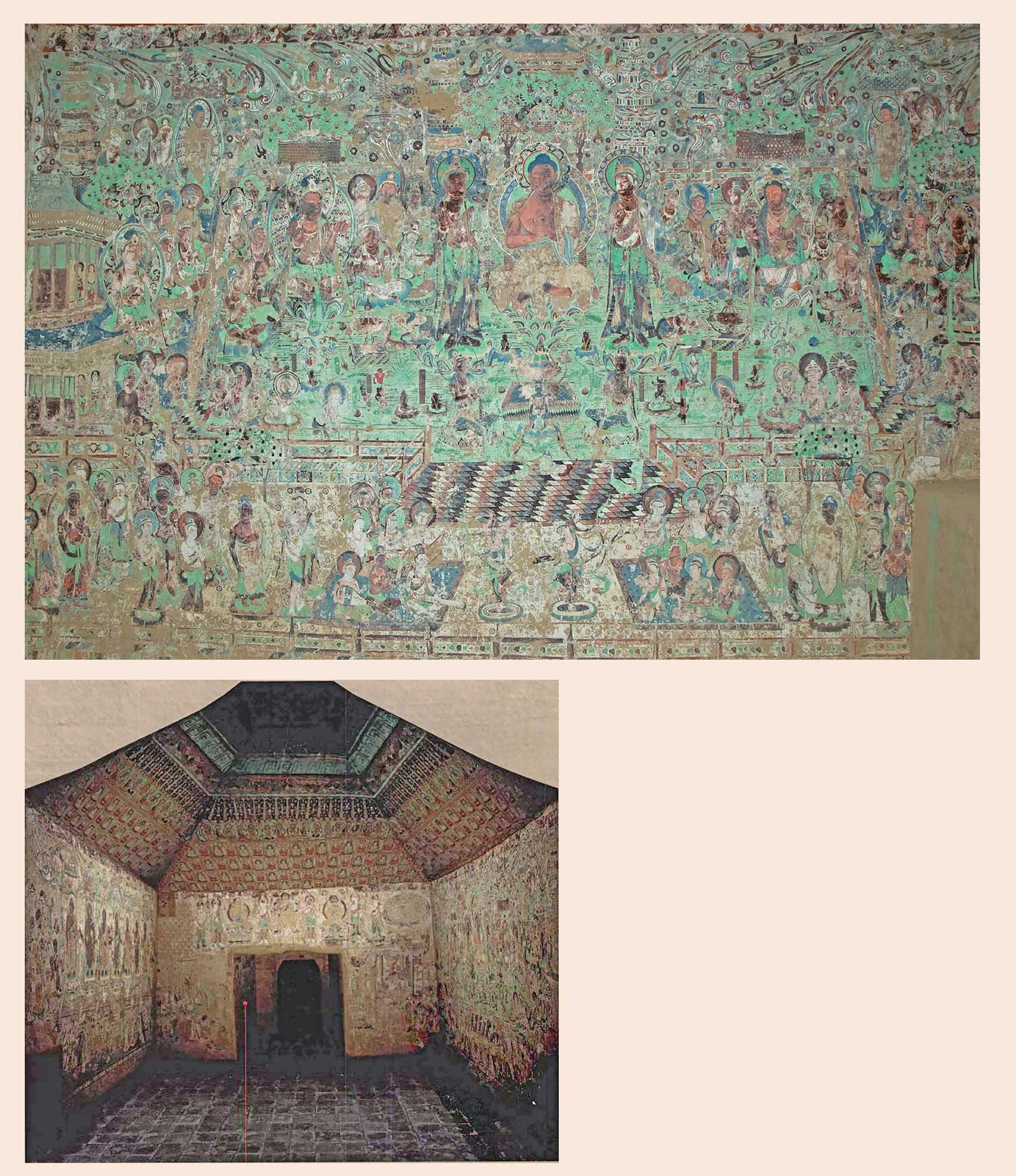 图17 莫高窟初唐第220窟洞窟内景及南壁净土变(采自施萍婷主编《敦煌石窟全集·阿弥陀经画卷》)