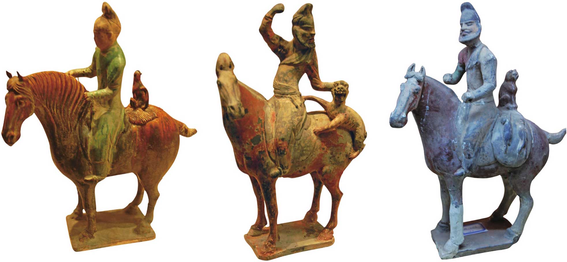 。他们或牵着满载物品的骆驼行走在漫长的丝路上(图1-2);或独自一人背负沉重的货物走街串巷(图1-3);或骑着来自中亚西域的良马,身后的马背上蹲着被他们驯服的豹子或猞猁(图1-4),为主人服务;或袒身露腹,正在玩把戏表演幻术(图1-5)