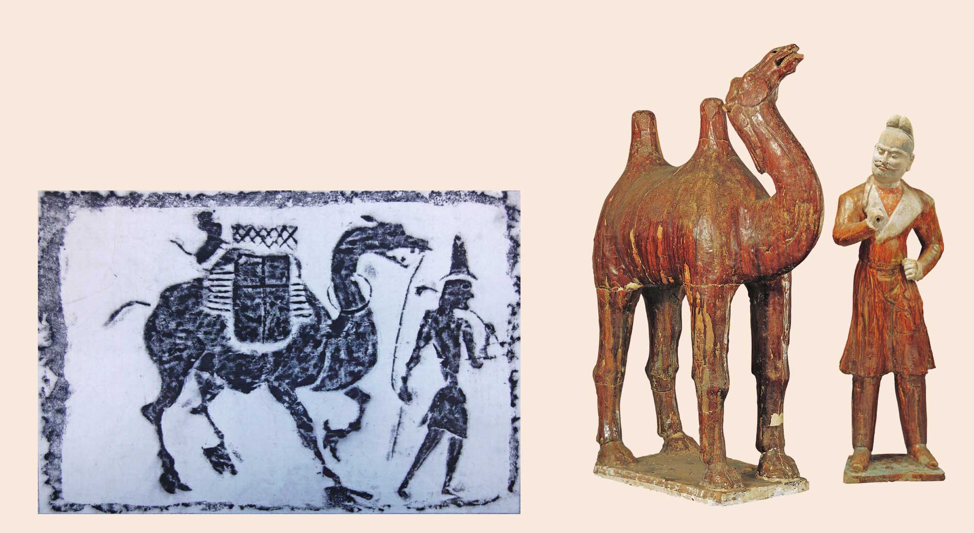 图1-2 唐墓出土胡人牵驼形象(左:敦煌唐墓出土模印砖拓片,右:秦安叶家堡唐墓出土)(分别为敦煌市博物馆和甘肃省博物馆提供)