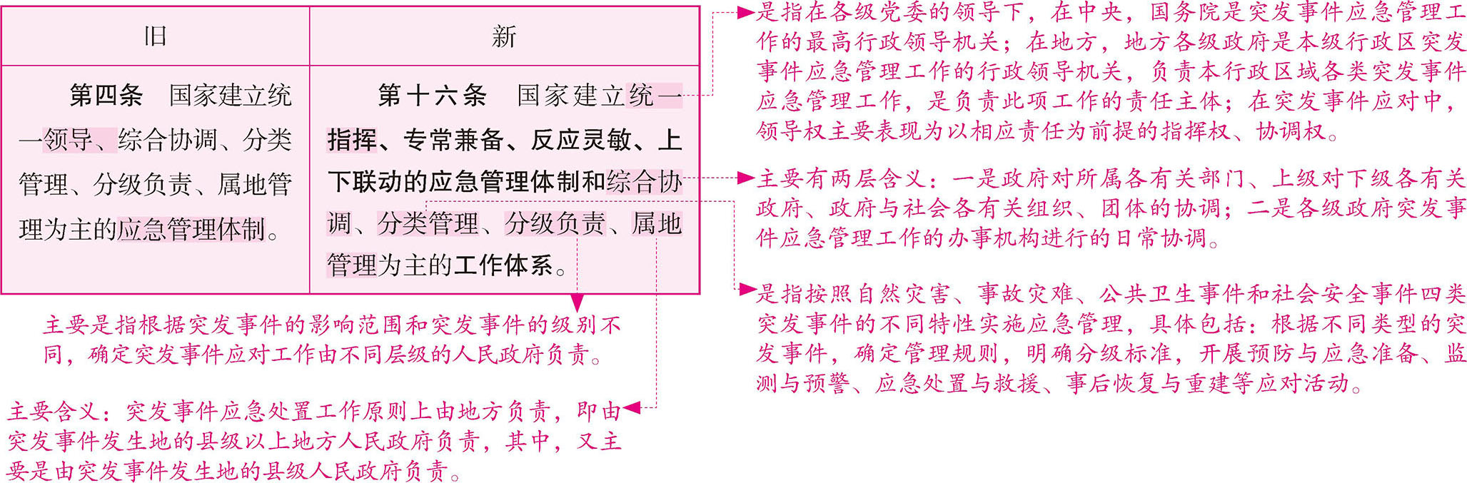 本条进一步明确我国应急管理体制和工作体系,以满足现代化突发事件应对工作的需要。