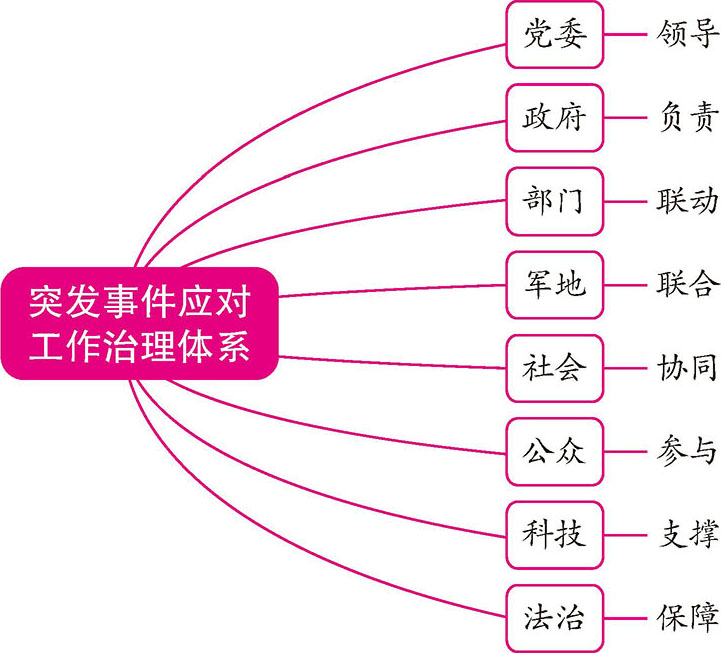 第四条 突发事件应对工作坚持中国共产党的领导,坚持以马克思列宁主义、毛泽东思想、邓小平理论、“三个代表”重要思想、科学发展观、习近平新时代中国特色社会主义思想为指导,建立健全集中统一、高效权威的中国特色突发事件应对工作领导体制,完善党委领导、政府负责、部门联动、军地联合、社会协同、公众参与、科技支撑、法治保障的治理体系。