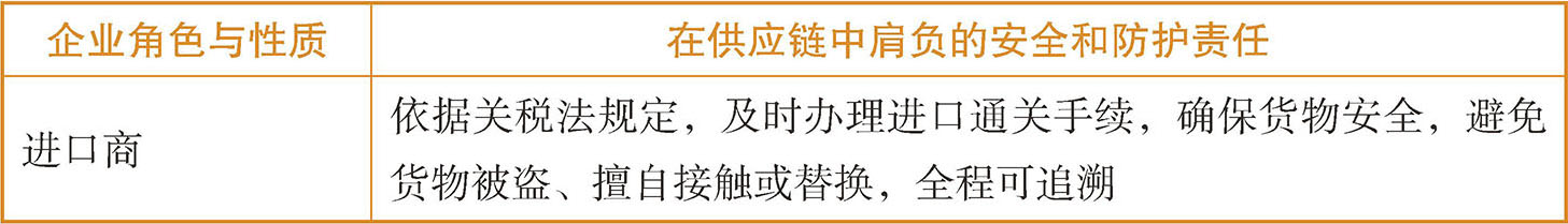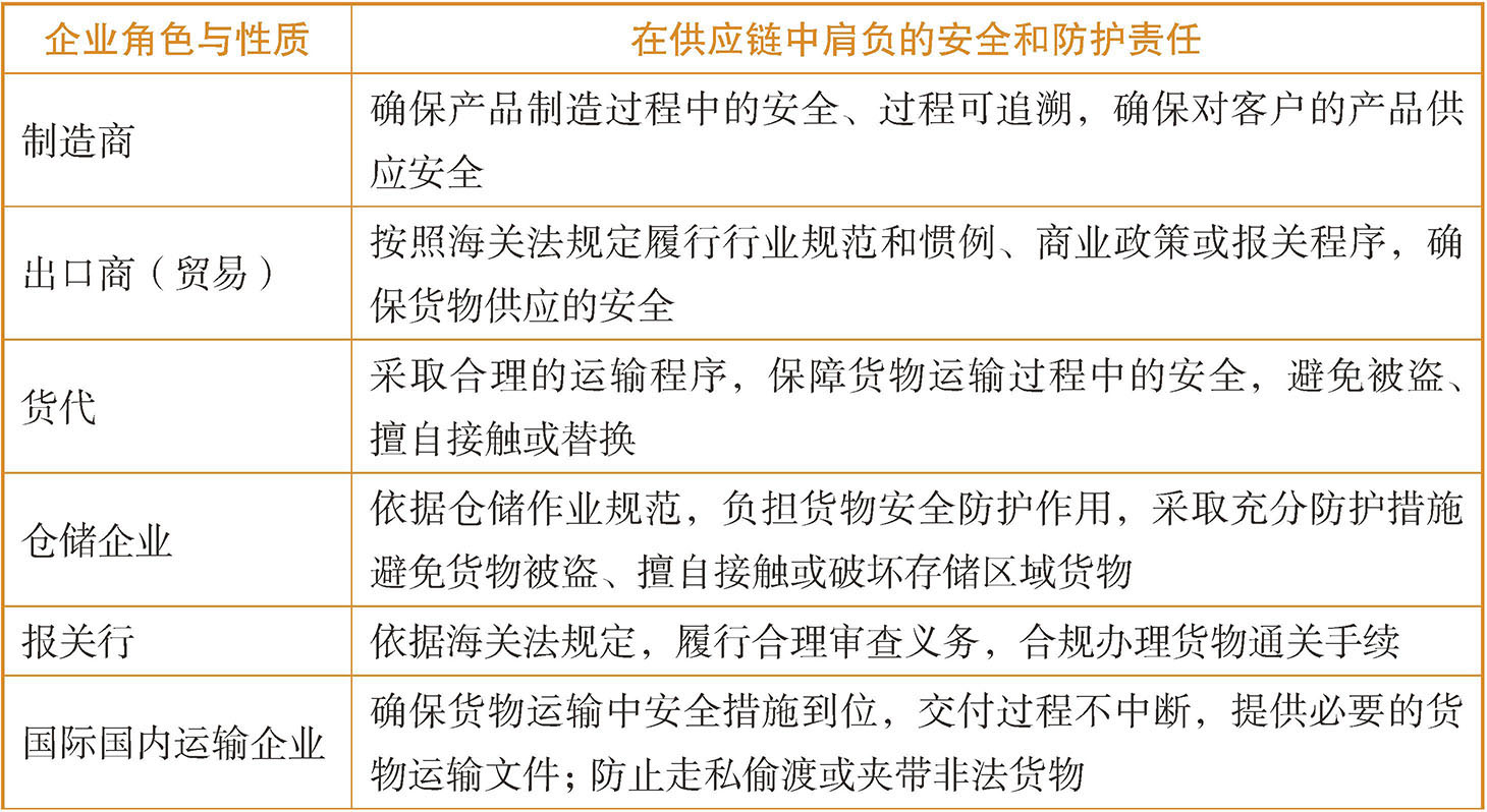供应商上下游贸易参与方中各自的安全责任有所不同,共同确保货物从发货地到目的地全程可追溯,货物交付不中断,从而实现构建海关、政府其他监管部门、供应商和客户等多方面可信、有安全保障的供应链体系,如图1-1、表1-2所示。