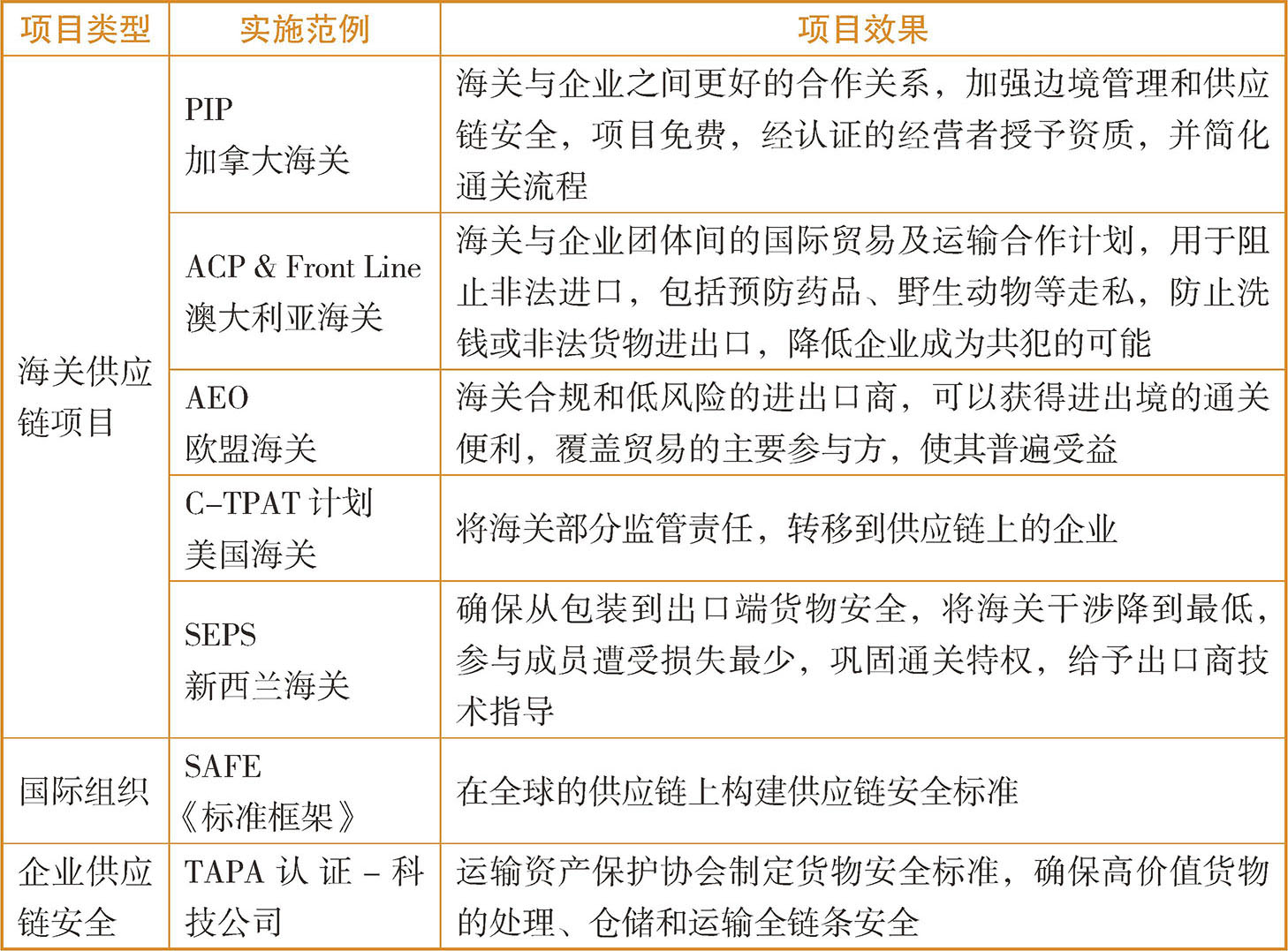 海关通过释放数千家AEO认证企业的便利化优惠待遇实现对几十万家进出口企业的精准监管,督促全链条上的进出口企业守法合规,社会效益非常惊人。 事实上,对供应链安全的持续关注也是世界上很多国家和区域经济体的通行做法,如表1-1所示。