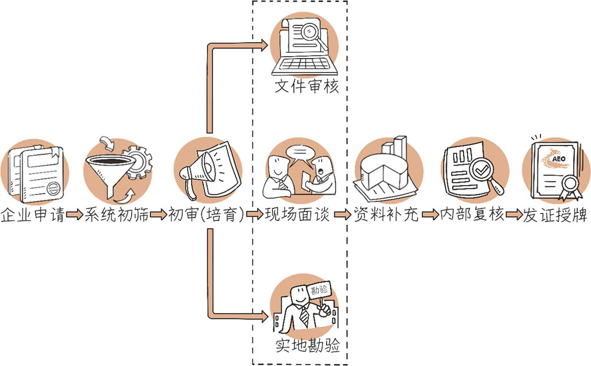 虽然不同关区细节略有区别,海关AEO认证审核循环大致按照图1-4所示的作业流程落实。整个过程包括海关的系统初筛、信用培育、文件审核、实地勘验与资料补充等,最终为企业颁发AEO认证证书。