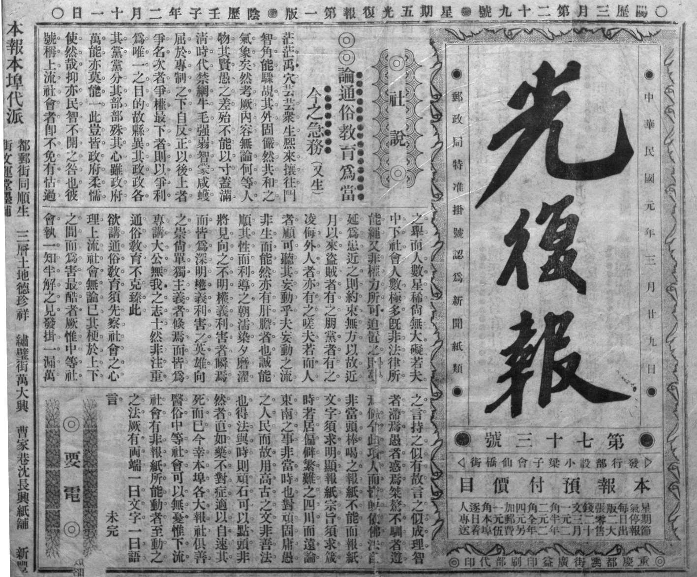 1911年11月,重庆蜀军政府成立,郭又生停刊《商报》,改出《光复报》。