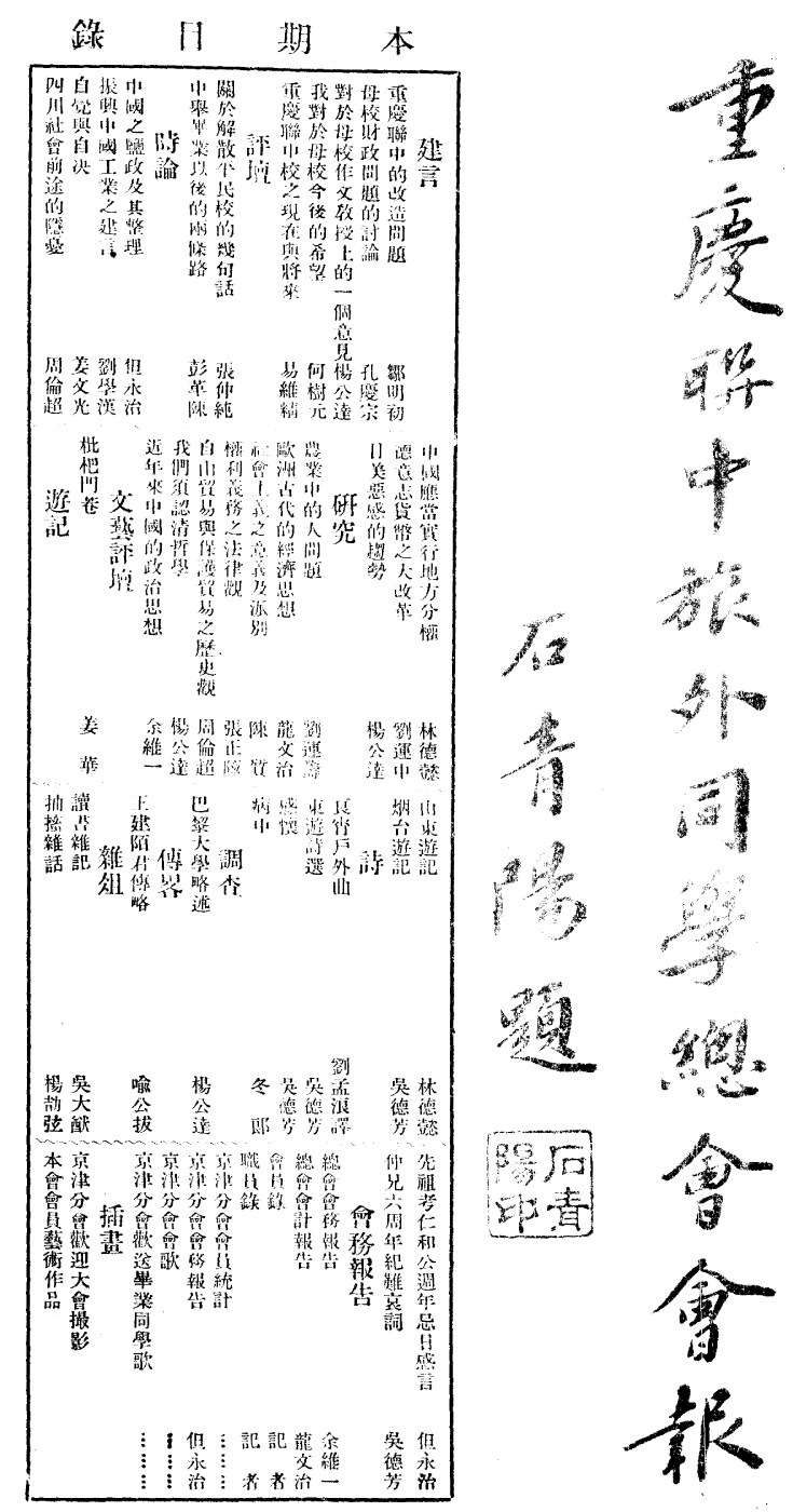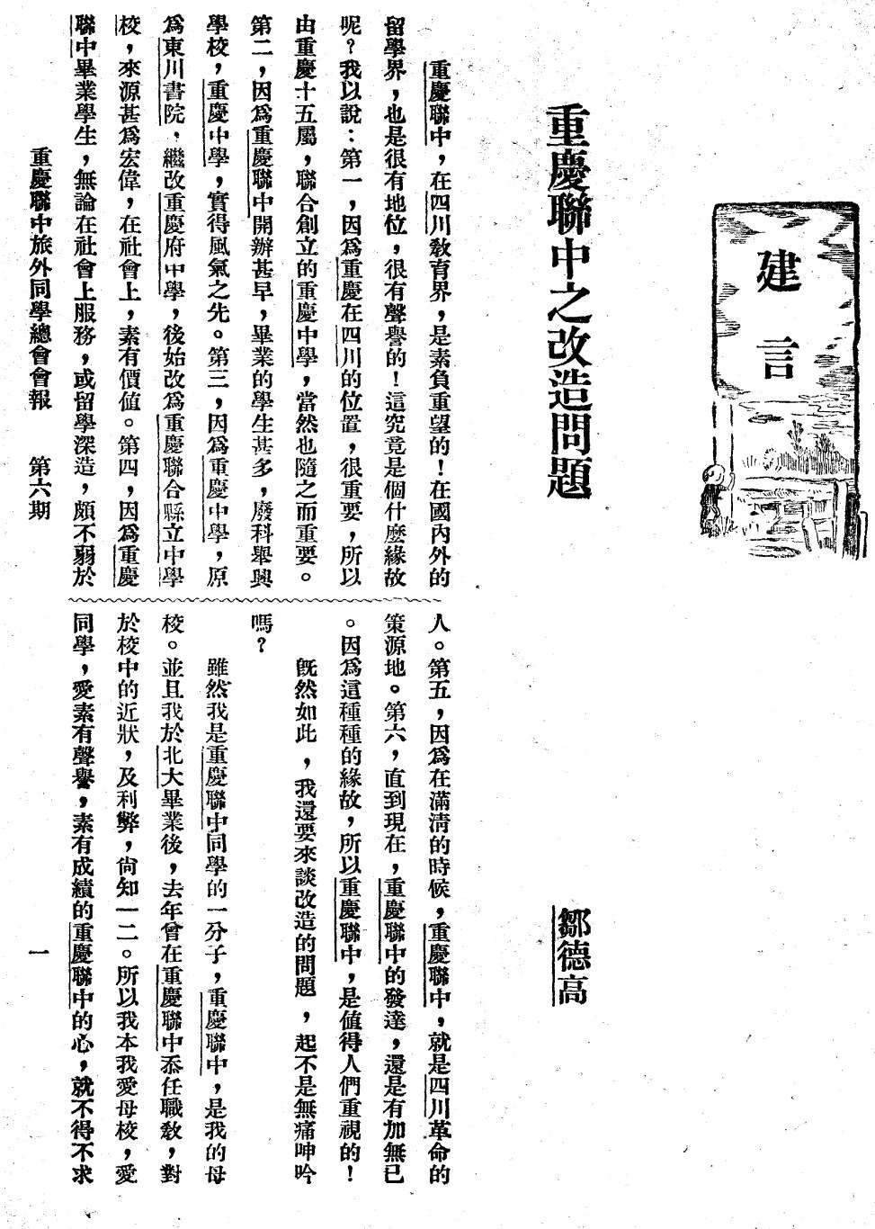 1918年创刊。该报以“交换同学智识,传达同学消息”为宗旨。先后担任会长的有何学海、舒启元,编辑主任舒启元、孔庆宗,编辑员李喧荣、孔庆宗、杨璇玉、徐孝忠、周伦超、官玉淮、封岳松、陈铭德、张璜、杨代馥等,会计主任牟凝、罗荣。内容有著述、调查、小说、文艺、杂剧以及会员通讯、会员消息等。编辑处设在北京,由北京重庆中校旅外同学总会编辑部编辑,北京重庆中校旅外同学总会发行,重庆中校旅外同学京津分会、上海分会、日本分会、成都分会、重庆联合县立中学校同学会均为分发处。第5/6期分别于1923年10月10日和1924年10月10日出版,并改名为《重庆联中旅外同学会会报》,由北京重庆中外旅同学总会编辑发行,北京前门外虎坊桥京华印刷厂印刷。内容增加特载、建言、评论、研究等栏目。