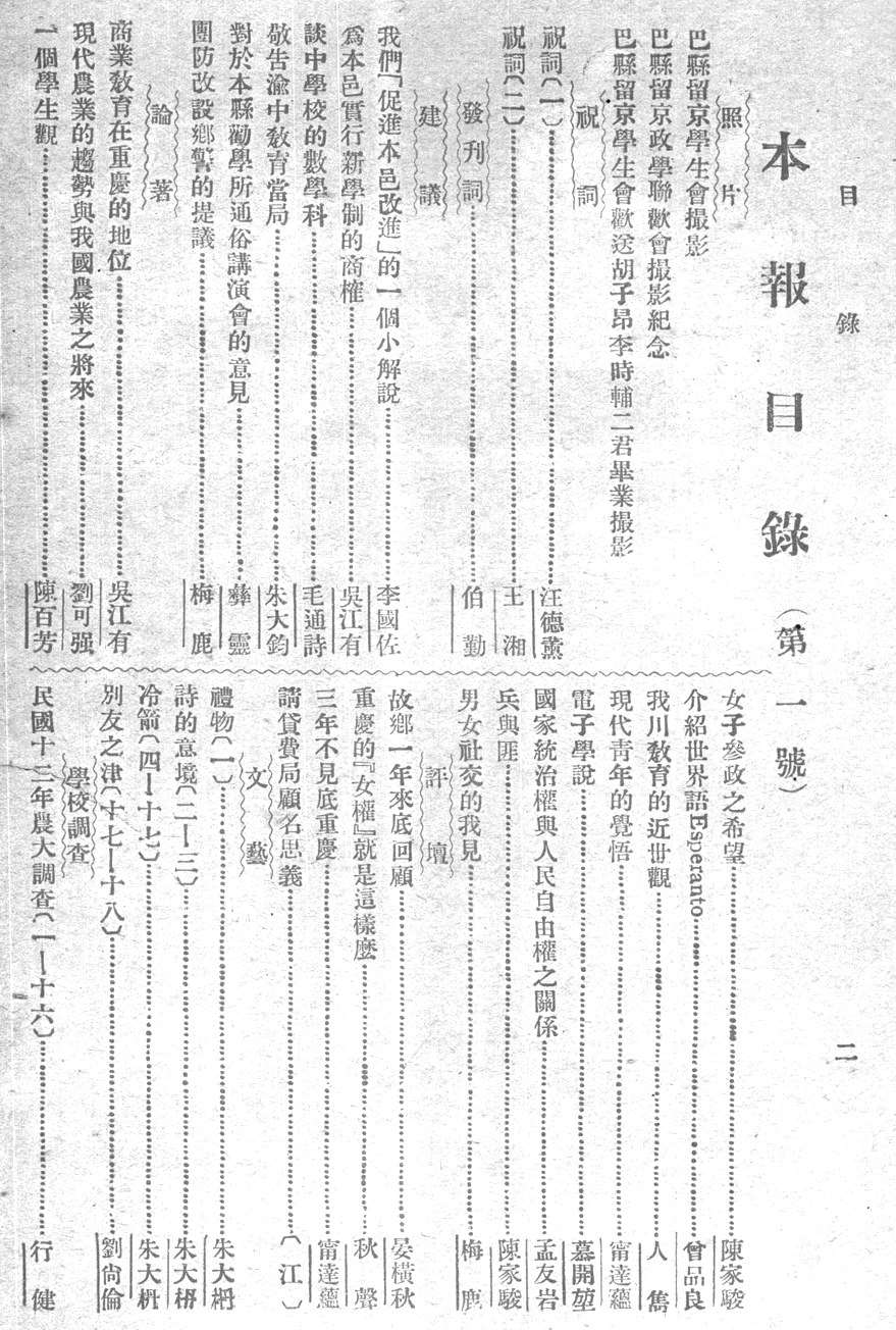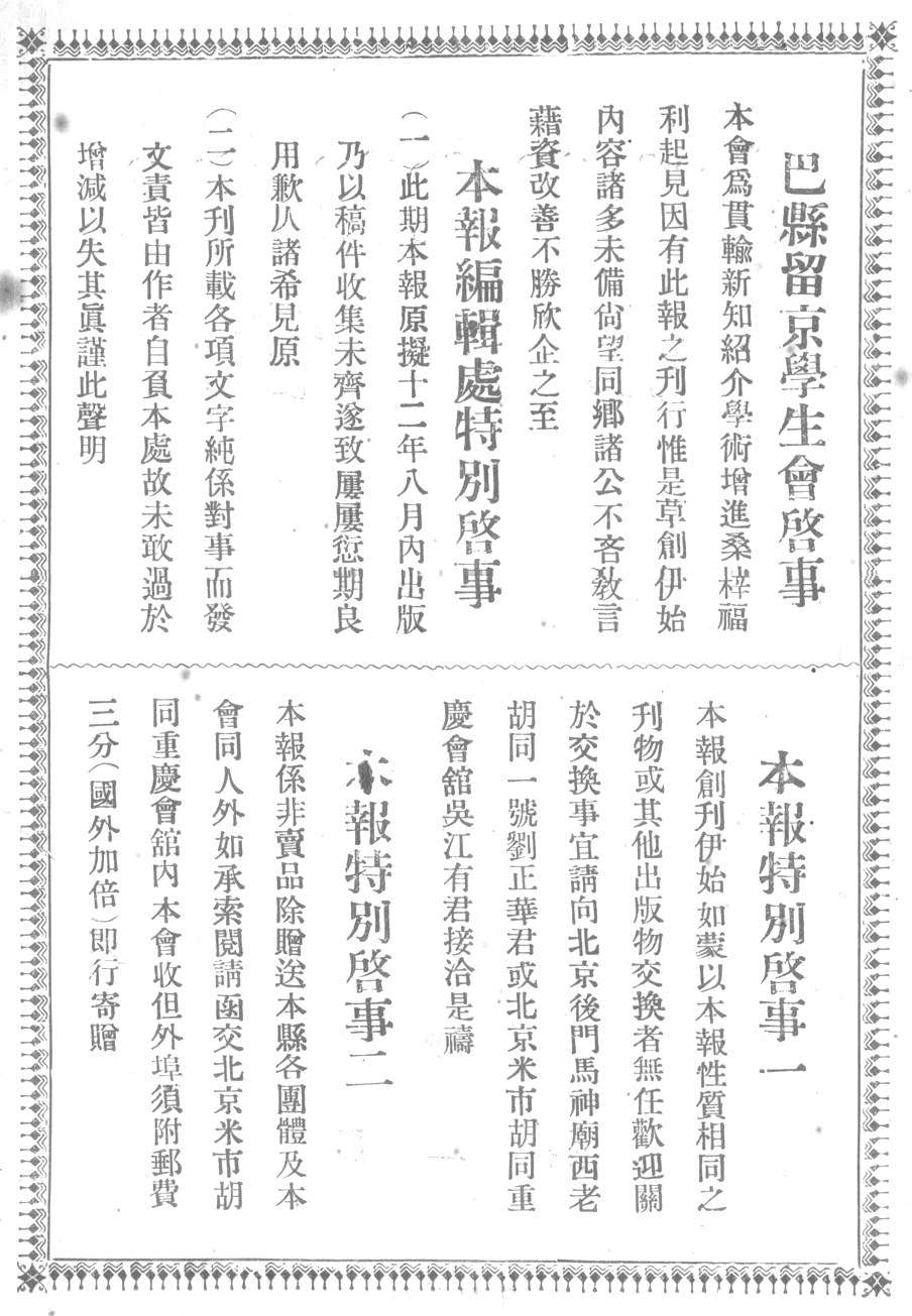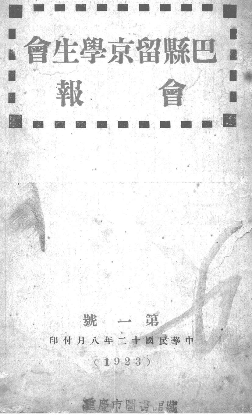 1923年8月创刊,16开本,铅印。巴县留京学生会编辑发行,社址在北京米市胡同重庆会馆内。