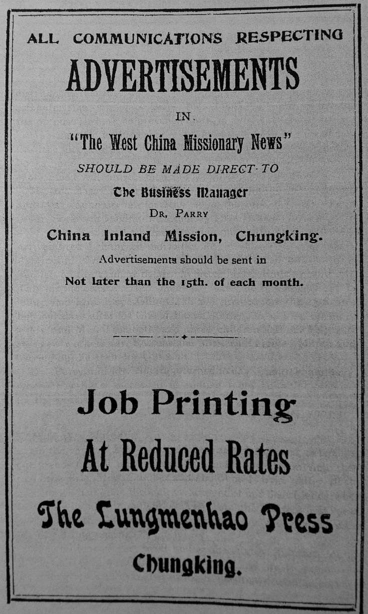 海外西方人士和在华基督教传教士是《华西教会新闻》的发行对象,由于该刊只在教会内部发行,所以发行量不大。1903年,杂志全年的发行量仅为222册,1904年为230册。1914年达到400册,但一直到40年代初每月的出版量基本保持在450册以内,而且发往国外的册数占了大多数。《华西教会新闻》工作费用最为重要的来源就是这大约450册的订购费用。因此,面对经费收入不足的困难,《华西教会新闻》为了补充经费收入迫于无奈只得依靠刊登广告和获得捐助这两种很有限的方式。