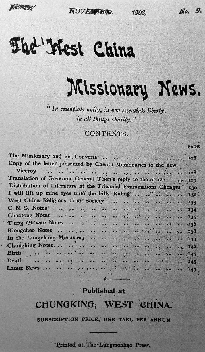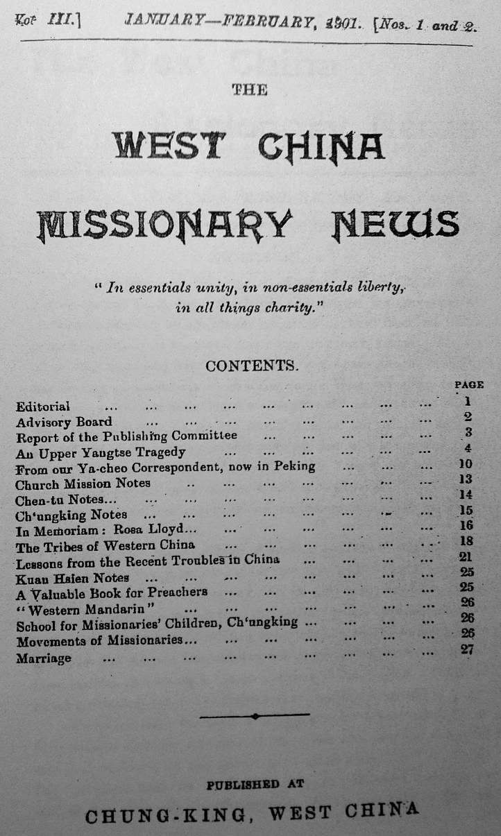 1899年1月,基督教华西各差会召开首次宣教大会,讨论决定为传教士们出版一份新闻通讯类的杂志,杂志的编辑和发行工作由陶维新夫人负责。与此同时,各地传教站的编辑和通信者也接受任命,被要求给杂志提供当地的新闻。《华西教会新闻》就这样产生了。