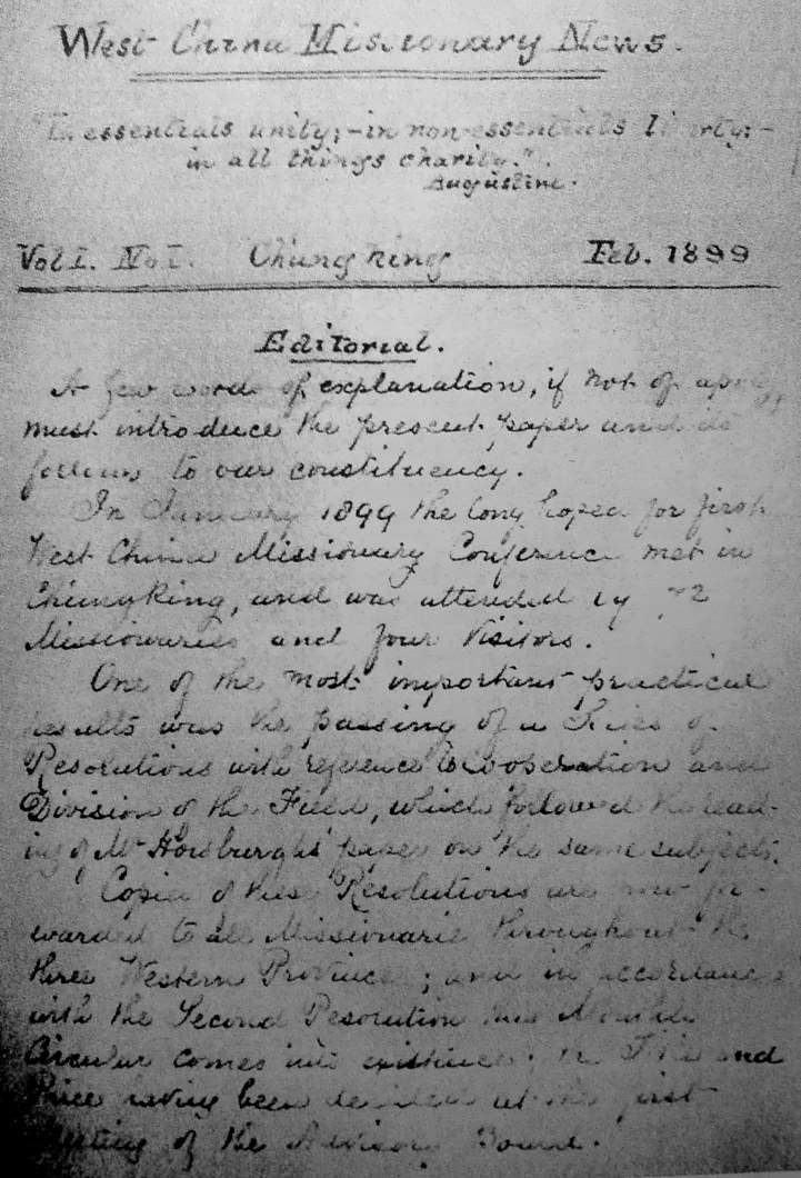 1899年1月,基督教华西各差会召开首次宣教大会,讨论决定为传教士们出版一份新闻通讯类的杂志,杂志的编辑和发行工作由陶维新夫人负责。与此同时,各地传教站的编辑和通信者也接受任命,被要求给杂志提供当地的新闻。《华西教会新闻》就这样产生了。