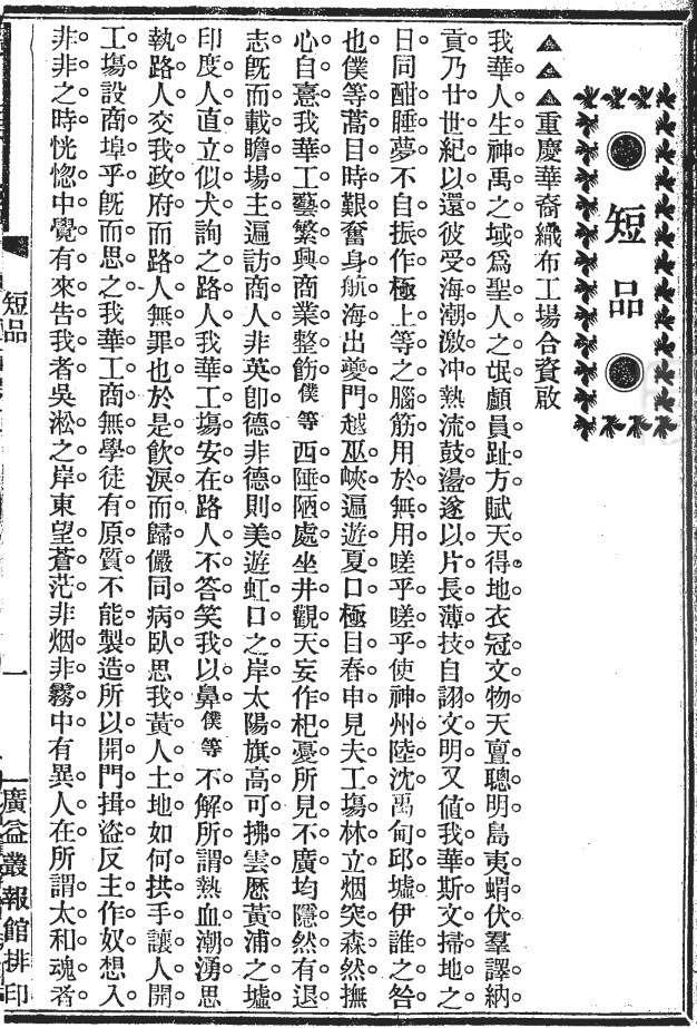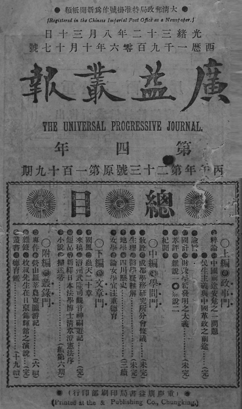 1903年4月16日创刊,是近代重庆和四川历史上出刊时间最长、影响力最大的综合性刊物。