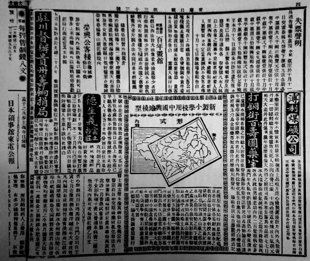 《重庆日报》从最初就十分重视广告客户的招揽工作。《重庆日报》的广告固定在报纸的第4版刊登,为使其与报纸上的其他文字相区别,报纸在广告前面冠有醒目的加了花框的“广告”二字。报纸还将专门为刊登广告而制订的详细具体办法每日刊登在报眼处,十分醒目。《重庆日报》上刊登的广告以文化教育和商行、客栈、照相、布庄、医馆等的广告为主,每天平均刊登八九条至十三四条。版面清晰规整,每条广告间用花线或黑线隔开。刊登的广告既有商业性的,也有很多非商业性、非营利性的。