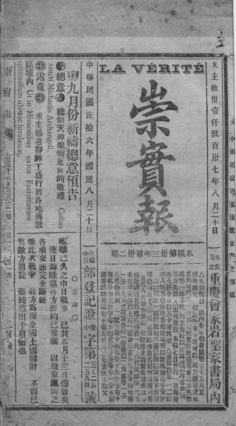 不过,通读该报,可知事实并不全然如此。《崇实报》的言论和文章主要分为三部分,第一是宗教部分,即对宗教教义和教务活动的报道,第二是政治部分,主要是对政治方面尤其是中国的政治事件和发展趋势的评论,第三是新闻部分,以国内外和四川省内各地的新闻为主。作为承担起其所谓“开启民智”重任的重要角色之一的“西学”板块却只有狭小的一栏,里面只有很少西方的天文历法和数学知识。
