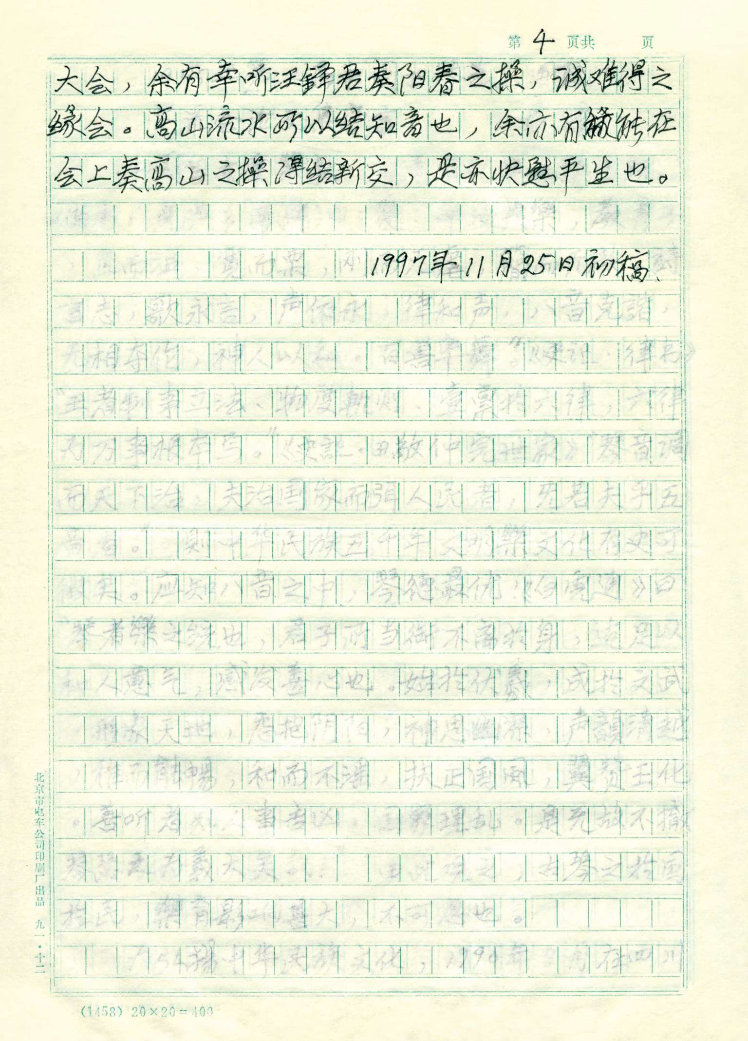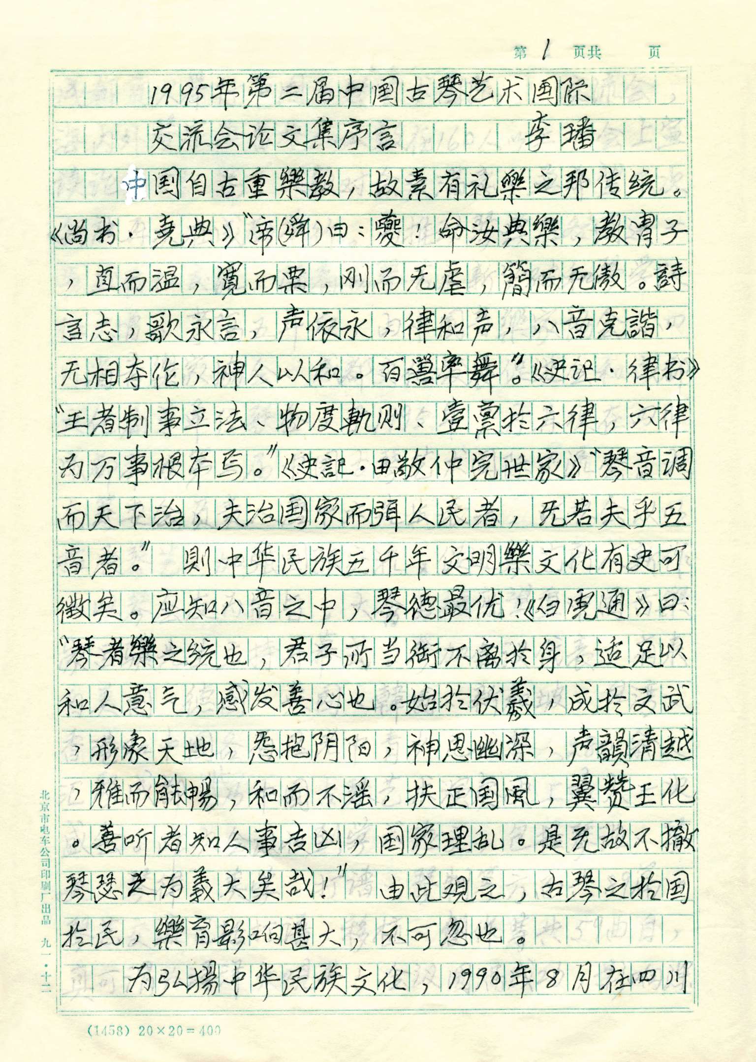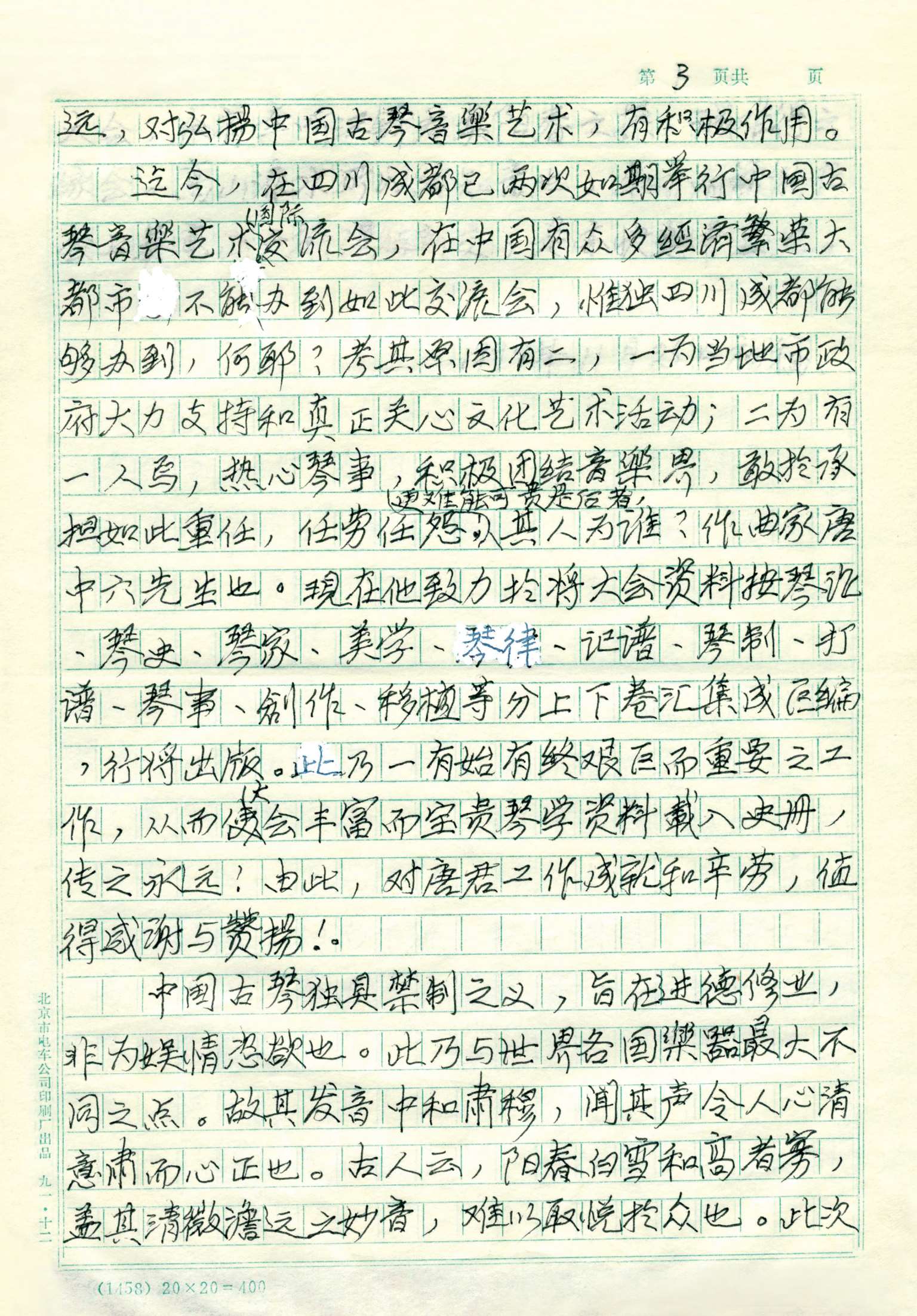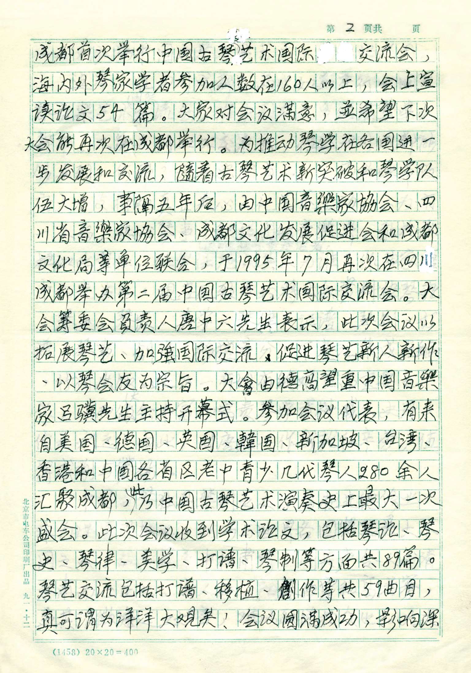 关于国际交流会,我以为应比上次交流会有所前进,有所发展。我与光钰同志初步谈了一点,大意是每次会议都应有明确目标,使这个会不能仅仅着眼于国际交流,而应该对我国古琴艺术有所发展,有所推进。我以为近若干年来,古琴艺术仅限于代代相传,未能推进其发展,使之与时代的发展同步,日渐与时代的发展相结合,这也许只是一种理想,但要使这种理想为大家所认识,为这理想而奋斗。不知你以为如何?