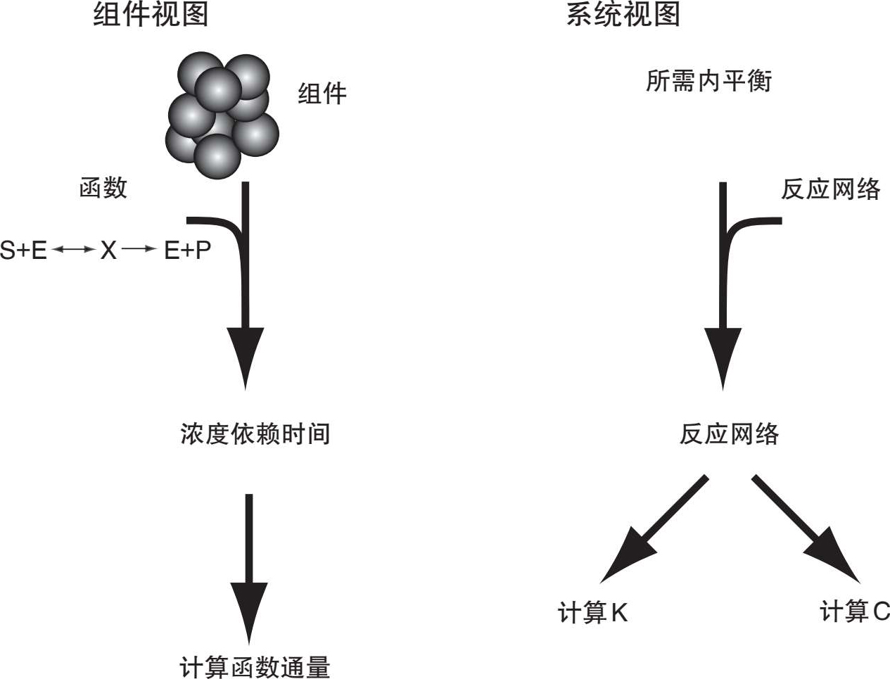 ●图2.1 左边从组件视角展示了基因产物的功能。当我们考察如图例中酶这样的基因产物功能时,我们把这个生物组件与它的底物一起放在一个实验容器中,然后观察这个底物消失的时序过程以及产物的产生过程。我们研究的这个组件就是该实验的中心,它导致了底物和产物的浓度时序变化。