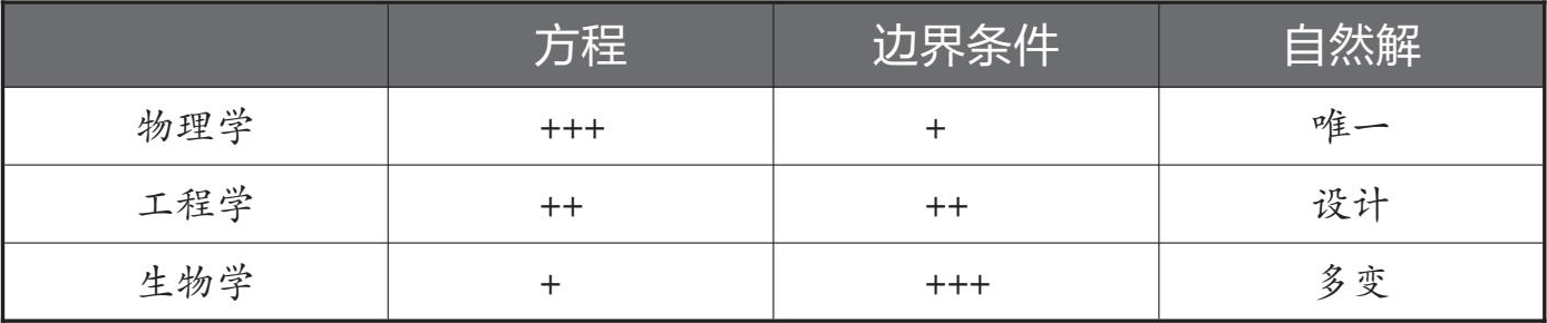 上面描述的关联边的特性、形成网络的方式和网络如何产生功能状态等机理,使得全基因组生物系统的计算建模与模拟将与生理生化建模的方式不同。首先就是一个生物网络可以具有很多不同状态,即不同的建模解决方案。哪个功能状态(即解决方案)被选中执行,决定于细胞的实际状态,这些选项是基于细胞在不同时间所经历的选择压力。这些从生理生化科学产生的区别参见图2.4。所有针对工程或物理学科的理论建模考虑都会尝试基于物理和化学定理来计算一个精确解。而在生物学中,一个网络可以根据物种不同的进化历史而从大量不同解决方案中选择一个,同时也可以采用不同但是等价的方式来产生同样的功能。因此生物学中的静默表型(silent phenotype)数学上同义于多个等价的网络状态。这导致了生物学与数学建模理论之间关键规律的有趣差异(如表2.1 所示)。