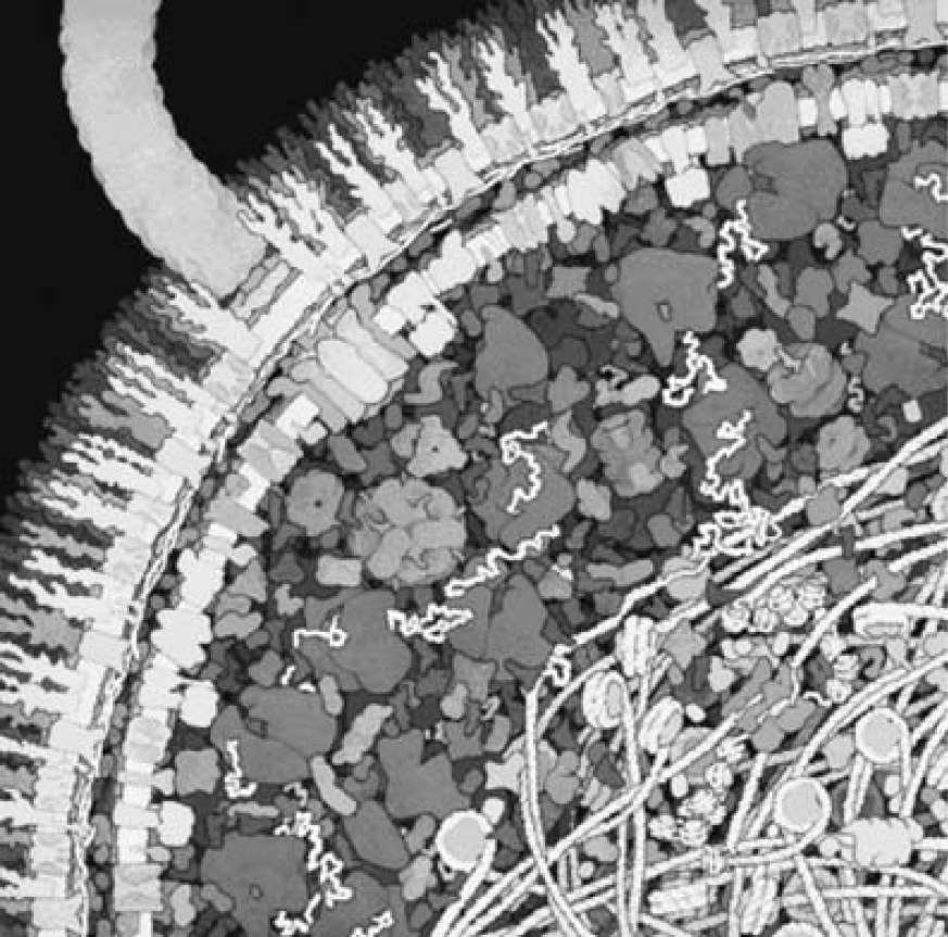 所以,所有生物组件关联可以形成网络。一个网络可以具有很多功能状态,其中只有一部分被生物实际选用。关联边、网络拓扑和网络目的都可以随着时间或环境因素的改变而改变。一个非常重要的事实是生化反应网络是在非常拥挤的细胞内部活动(见图2.3)。因此生物过程的网络视图必须是三维空间中的网络设置。这种设置条件也限制了像电路芯片网络这样的其他人造网络。