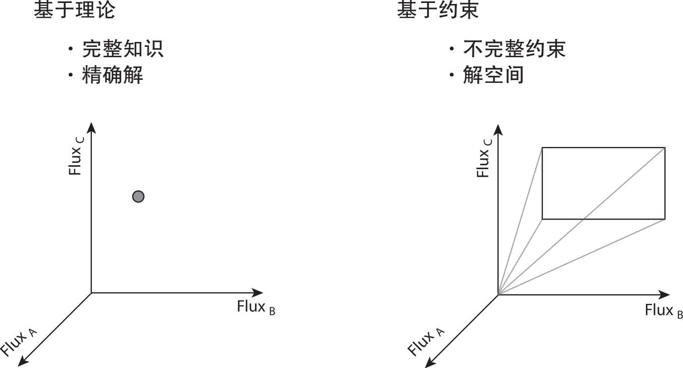 综上所述,我们发现用于描述细胞内环境物理规律的数学公式几乎没有已知的,并且生物网络功能状态还会随着时间而不断变化和进化。因此描述生物学功能的基础公式在现阶段难于提炼总结。从另一个角度来说,描述细胞进化生长的内环境限制条件是明确定义给出的。基于约束的方法来分析复杂的生物系统已被证明是非常有效的(参见本书第三部分)。