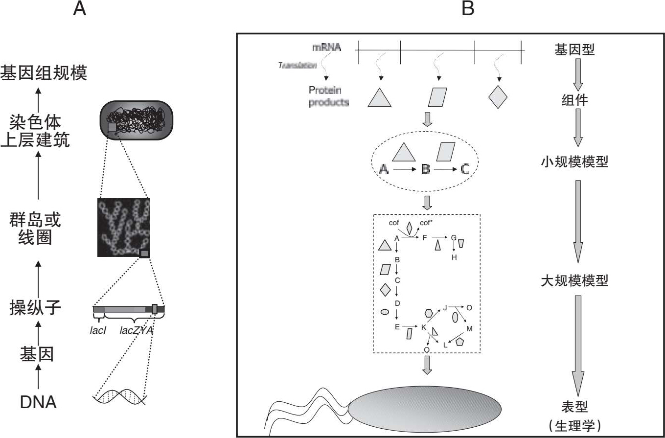 图2.6:细胞中的层次化组织结构。(A)细菌基因组,和(B)网络拓扑结构和功能。图片来源:由Timothy Allen(A)和Jason Papin(B)提供