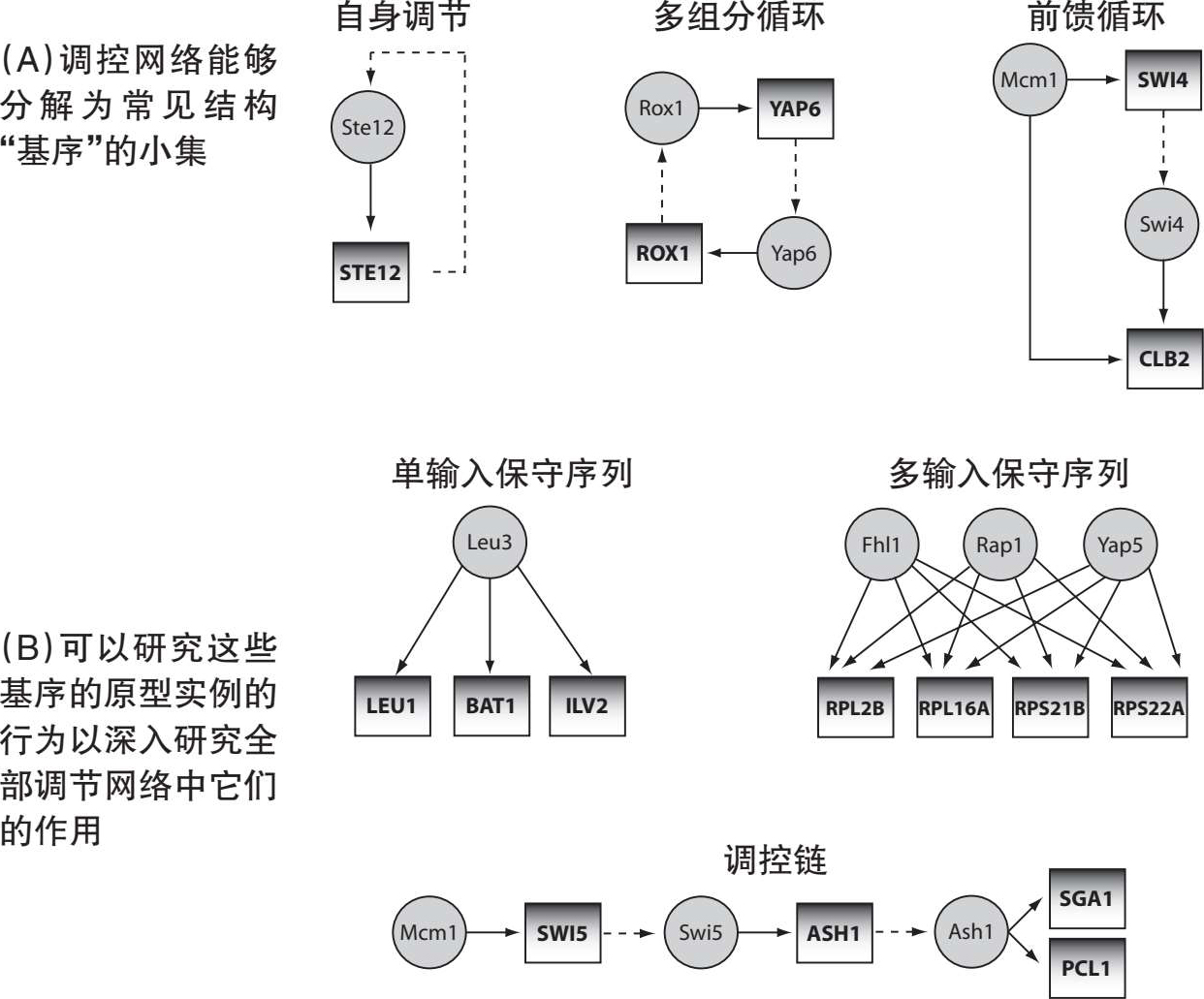 图4.3:转录调控网络中的保守序列:(A)改编自参考文献[207],(B)改编自参考文献[188]。根据参考文献[207]重绘