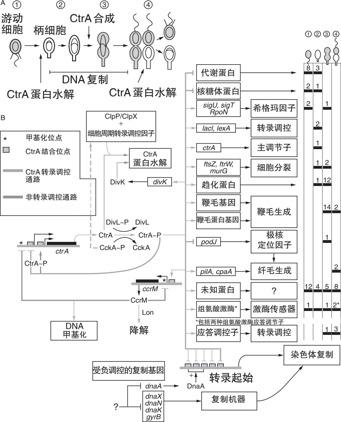图4.7:新月柄杆菌细胞周期调控网络示意图。资料来源: Science 301:1874-1877