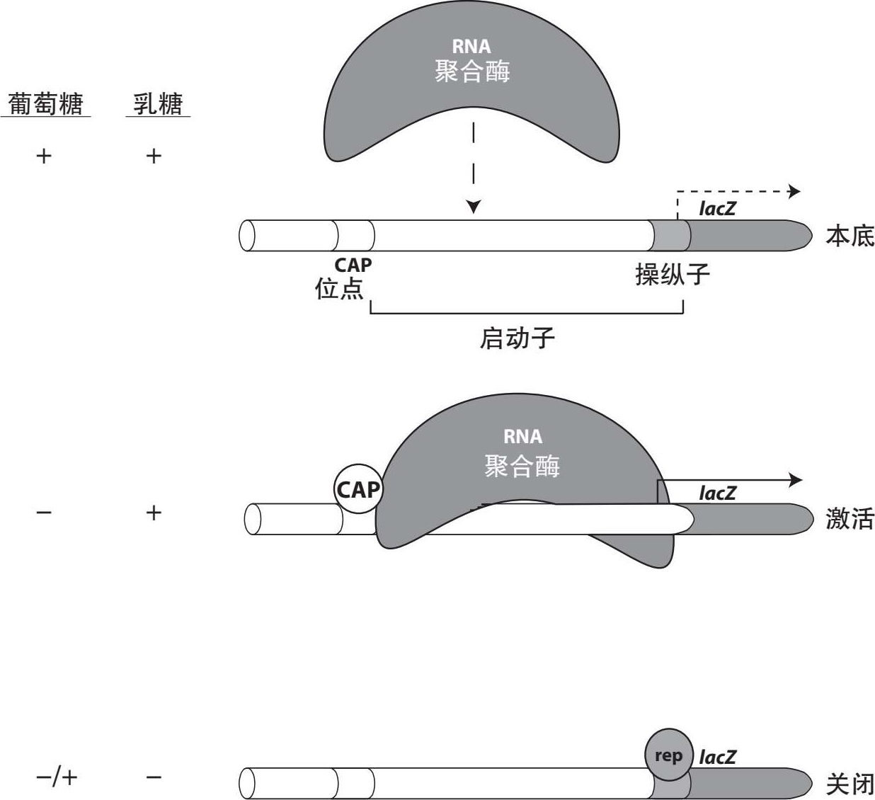 (1)如果乳糖和葡萄糖同时存在,乳糖阻遏蛋白和CAP都不会与DNA结合,RNA聚合酶与启动子弱结合,乳糖操纵子在低基准水平转录。
