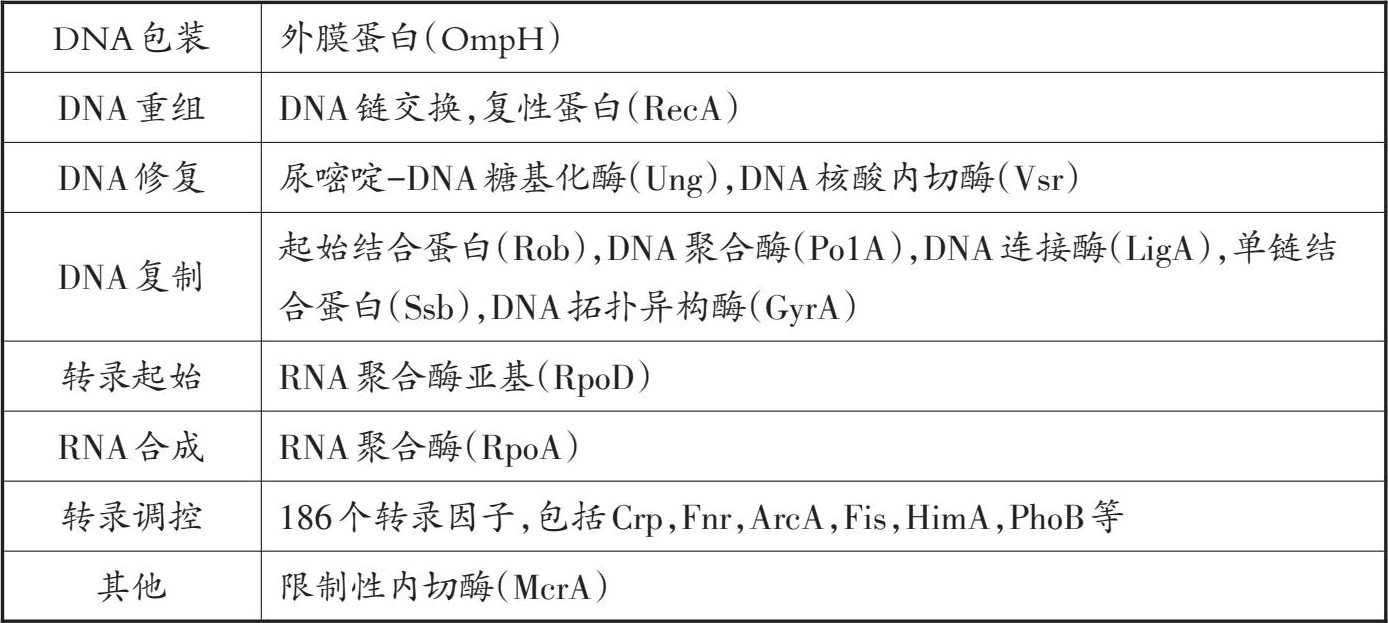 大肠杆菌DNA结合蛋白分为以下几个主要类别:DNA包装、DNA重组、DNA修复、DNA复制、转录起始、RNA合成和转录调控(见表4.1)。大多数参与转录调控和DNA修复的蛋白质识别特定DNA序列,并优势性结合到这些靶序列上,而其他蛋白则非特异性结合大肠杆菌基因组的不同位置。