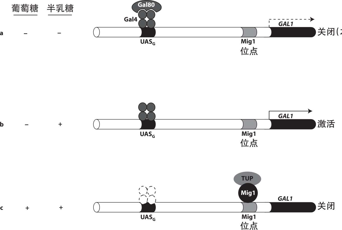 转录蛋白基因与半乳糖分解有关,半乳糖是一种己糖,转录蛋白基因的转录受到半乳糖的诱导和葡萄糖的抑制。半乳糖诱导是通过DNA结合活化因子转录蛋白基因,抑制是通过DNA结合抑制子进行。与乳糖操纵子类似,该调控系统可以界定出三种不同的结合及功能状态(图4.2):