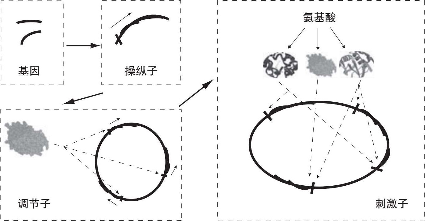 对于新陈代谢,可以从几个抽象层面来考虑转录调控网络(如图4.4)。最简单的元素是基因,有些基因是组成性表达,这意味着它们总是在相对恒定的水平转录。其他基因受到调控,转录调控网络诱导或者抑制这些基因的表达。在基因组上一组定位毗邻并且同时转录的基因,组成特定的单元称为操纵子。这种排列方式首先是在原核生物基因组中发现的。调节相关的基因组合成一组称作调节子,其中某些特定调节蛋白可结合到DNA的多个位置,从而引发对相关基因甚至是多个操纵子的诱导或抑制(或两者均有)。这种协同调控模式是真核生物所选择的调控方式。