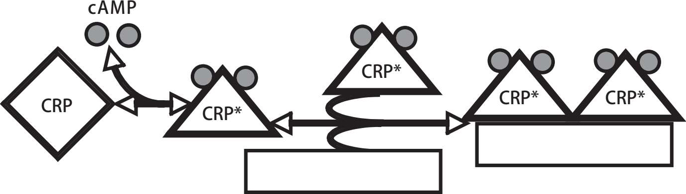 图4.10:转录因子结合到DNA的化学机制示意。转录因子存在两种构象状态,与DNA结合或未与DNA结合,这种机制与变构酶的作用原理相似。图片由Jennie Reed提供