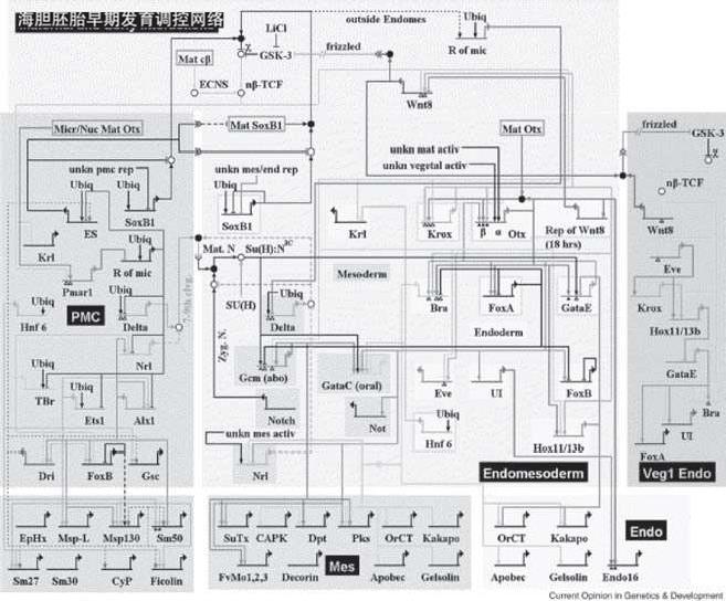 图4.8:海胆中胚层基因调控网络示意图。该网络结构依据基因表达分析、实验扰动和顺式调控分析得到。图片来源:参考文献[147]