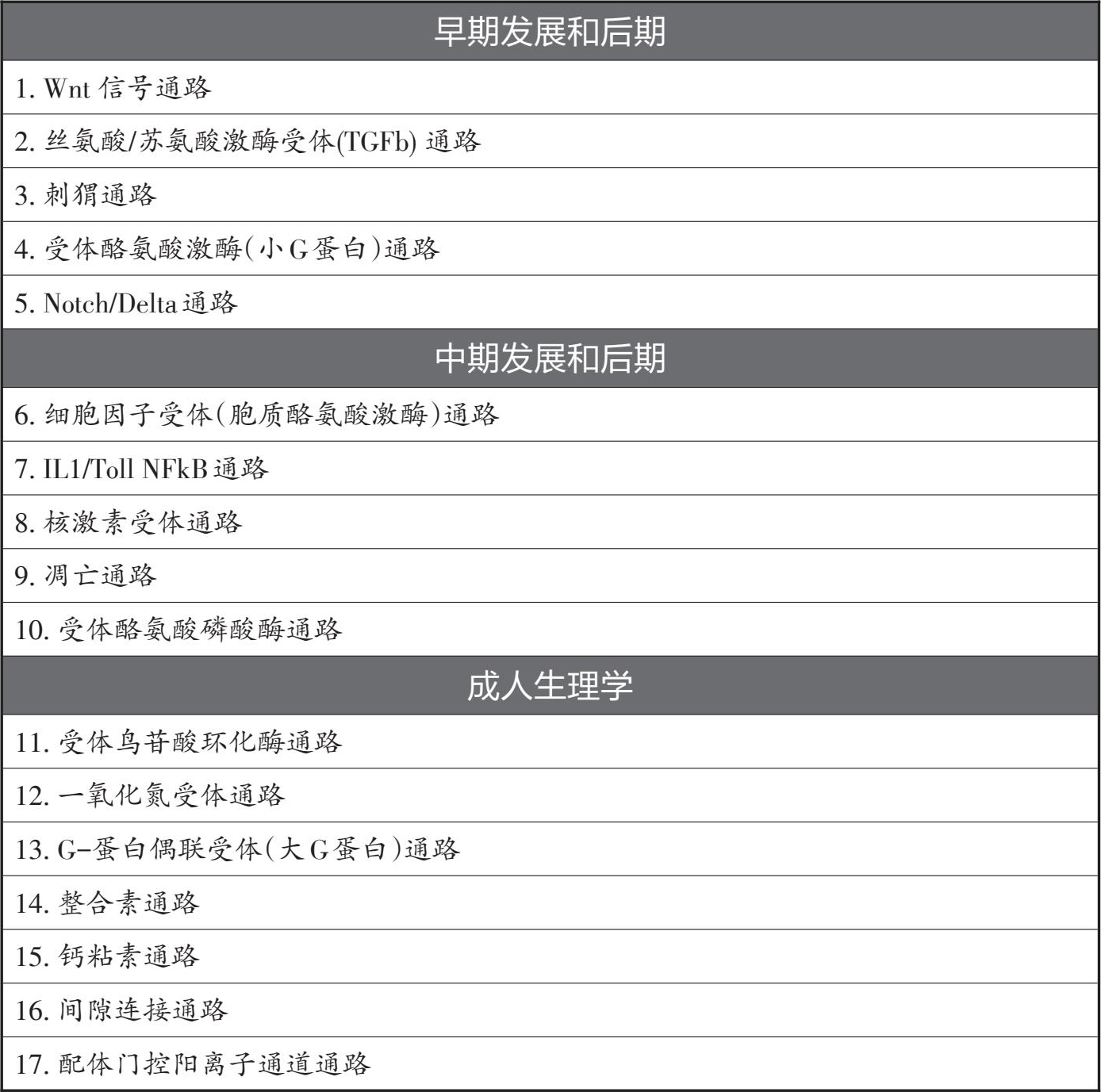 根据共享的组成物对信号过程进行分类,并理解一些基本的标记函数是有作用的。一个分类模式将信号过程分组为 17 个不同的家族(见表5.1)。这 17 个家族基于它们的发展过程被进一步分为三个组。例如:Wnt受体丝氨酸/苏氨酸,抑制剂,受体酪氨酸激酶(小G蛋白质),Notch/Delta通道在大多数动物细胞早期发展过程中具有独有的相关性。可能会有许多不同的蛋白质同系物参与到这些通道中,并且为各种各样的信号刺激提供额外的特征。