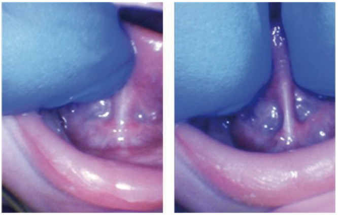 婴儿后舌系带:舌抬高和两指评估显示粗的、限制性的舌系带。