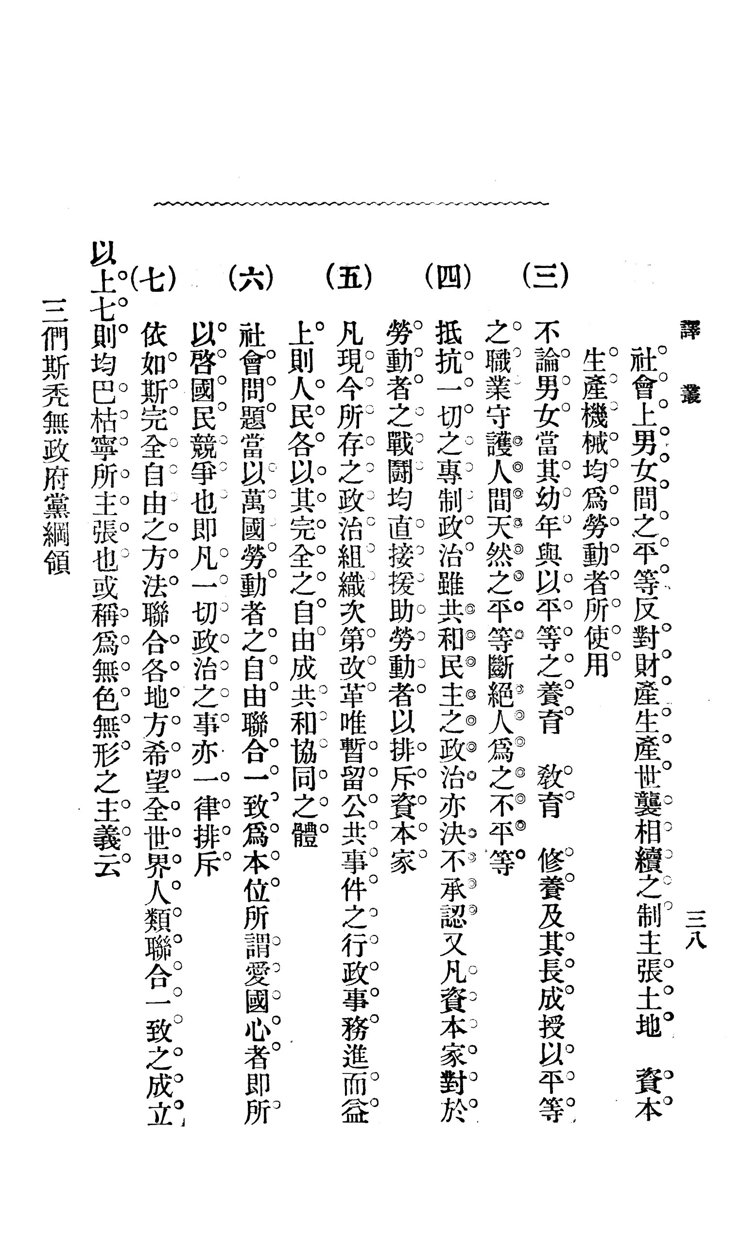 (五)凡现今所存之政治组织,次第改革,唯暂留公共事件之行政事务,进而益上,则人民各以其完全之自由,成共和协同之体。