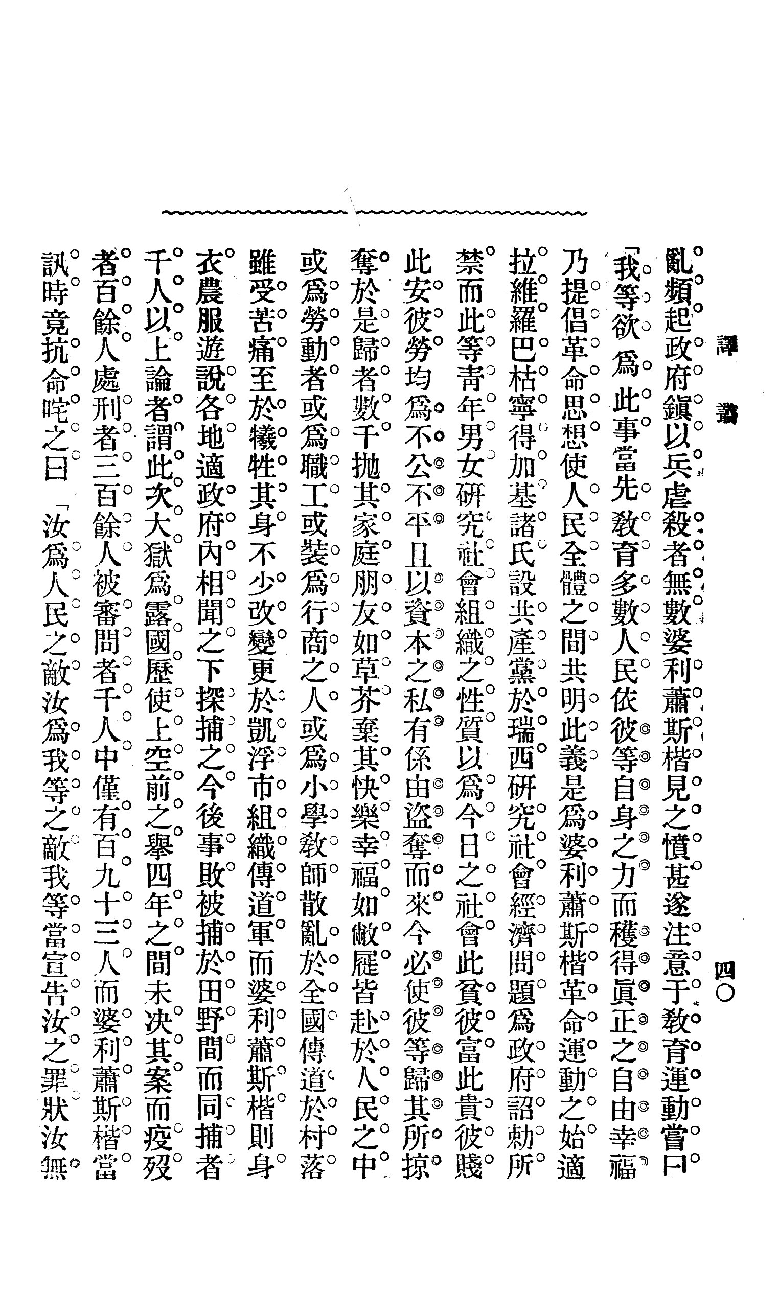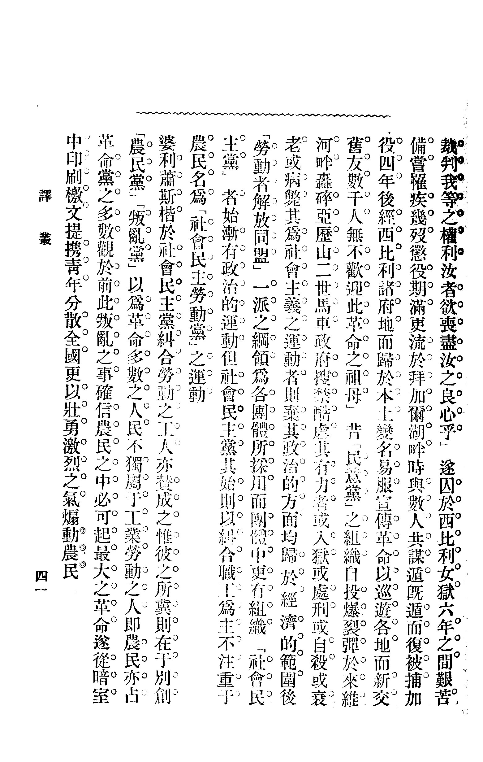 此“革命社会党”创立之时人数甚少,今则势力蔓延如燎原。因党中有“人权防护会”,一部其志士之热心者,传道于全国农民之间,以新闻、杂志、檄文秘密散分,而其文则均婆利萧斯楷之所著。盖彼女运动,均凭笔力以扩张党势,其处理党务,则席不暇暖,以周巡于全国。