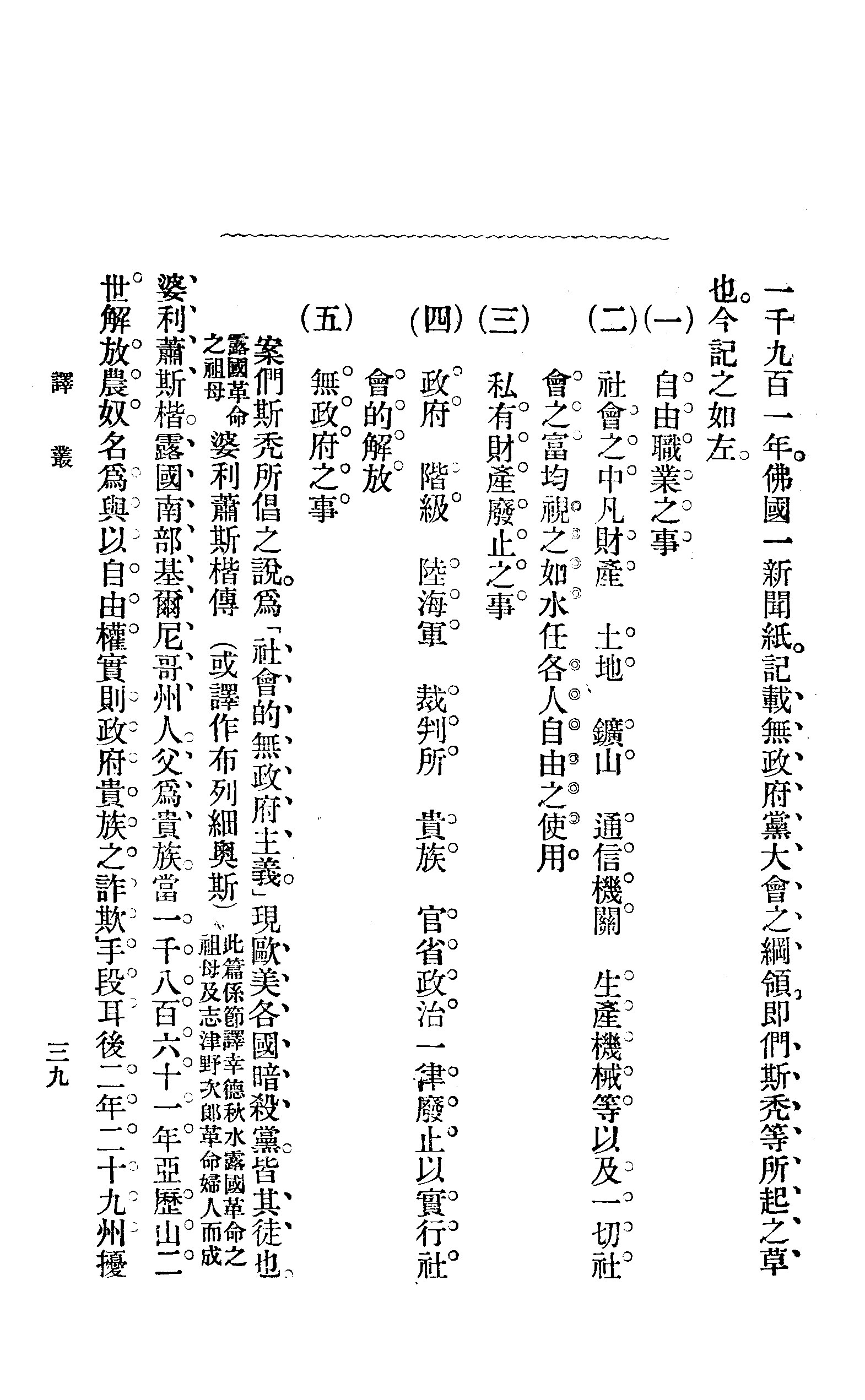 一千九百一年,佛国一新闻纸记载无政府党大会之纲领,即们斯秃等所起之草也。今记之如左。