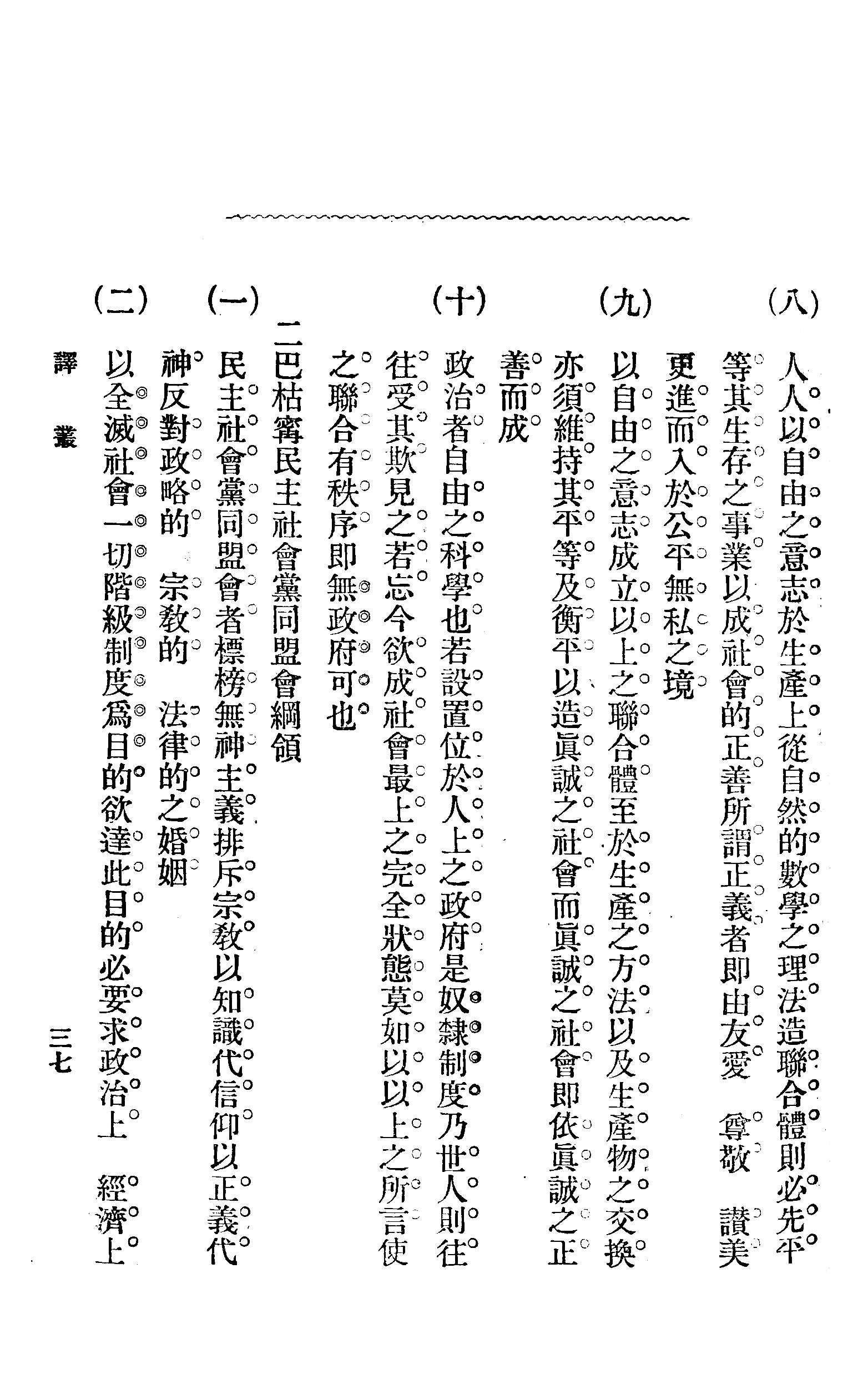 (九)以自由之意志,成立以上之联合体。至于生产之方法,以及生产物之交换,亦须维持其平等及衡平,以造真诚之社会。而真诚之社会,即依真诚之正善而成。