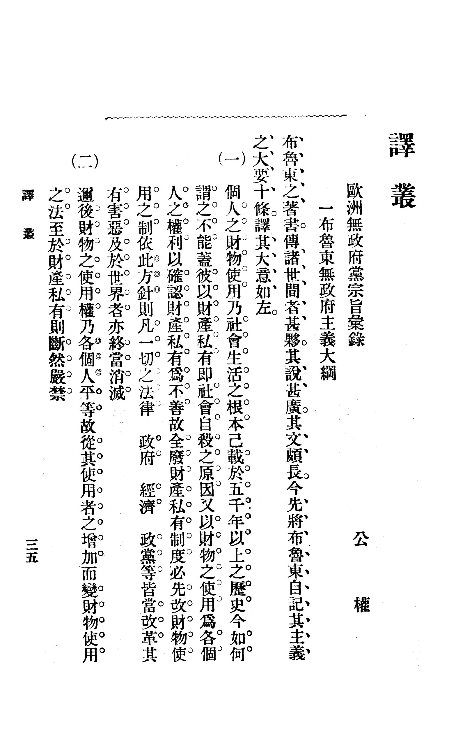 (一)个人之财物使用,乃社会生活之根本,已载于五千年以上之历史。今如何谓之不能,盖彼以财产私有,即社会自杀之原因;又以财物之使用为各个人之权利,以确认财产私有为不善。故全废财产私有制度,必先改财物使用之制。依此方针,则凡一切之法律、政府、经济、政党等,皆当改革。其有害恶及于世界者,亦终当消灭。