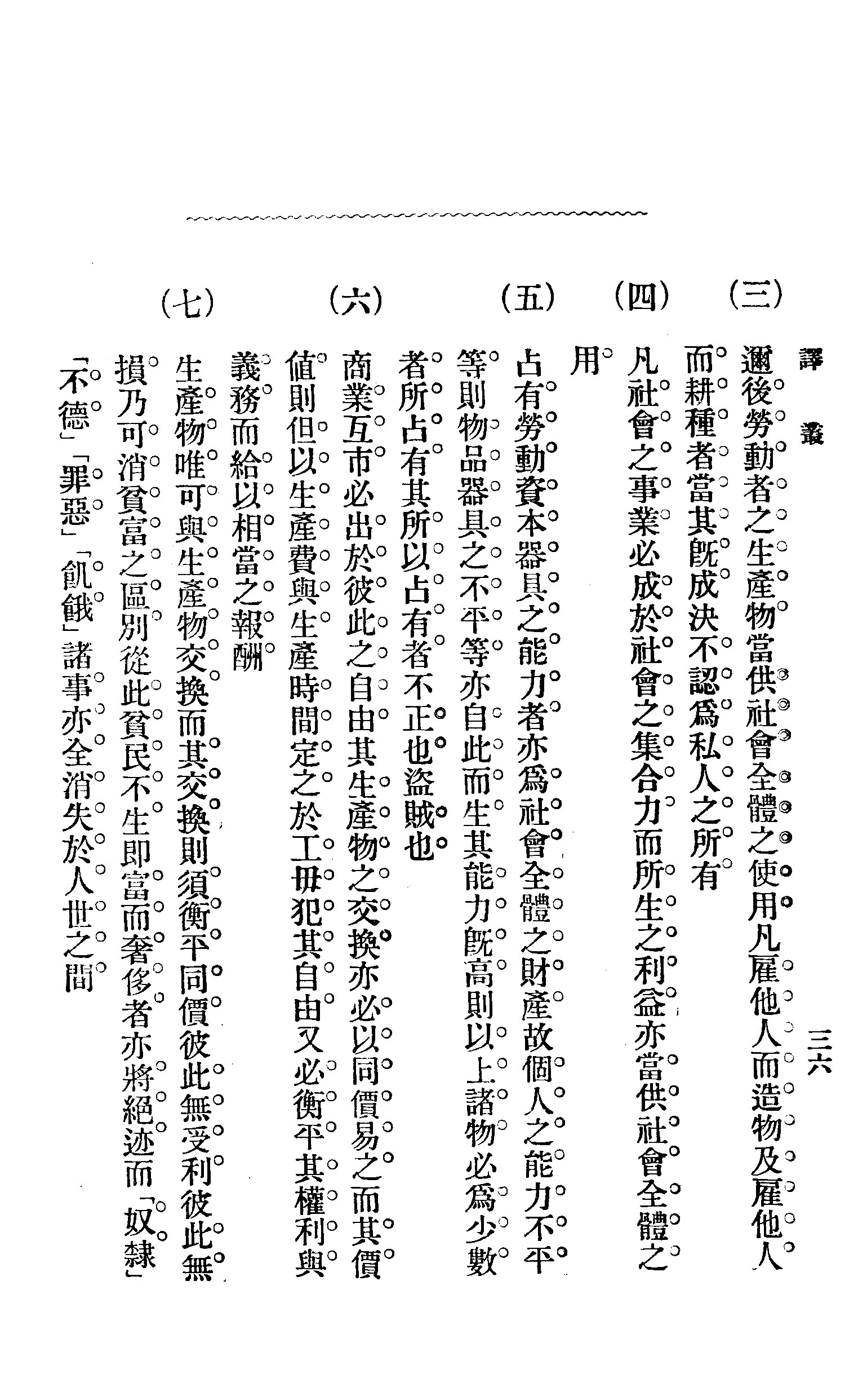(三)迩后劳动者之生产物,当供社会全体之使用。凡雇他人而造物及雇他人而耕种者,当其既成,决不认为私人之所有。