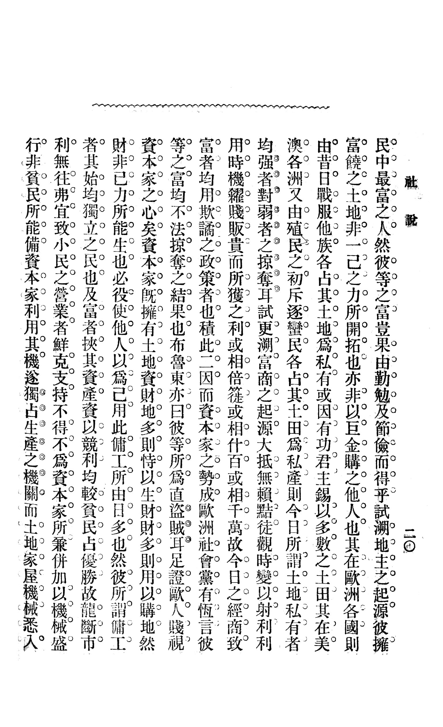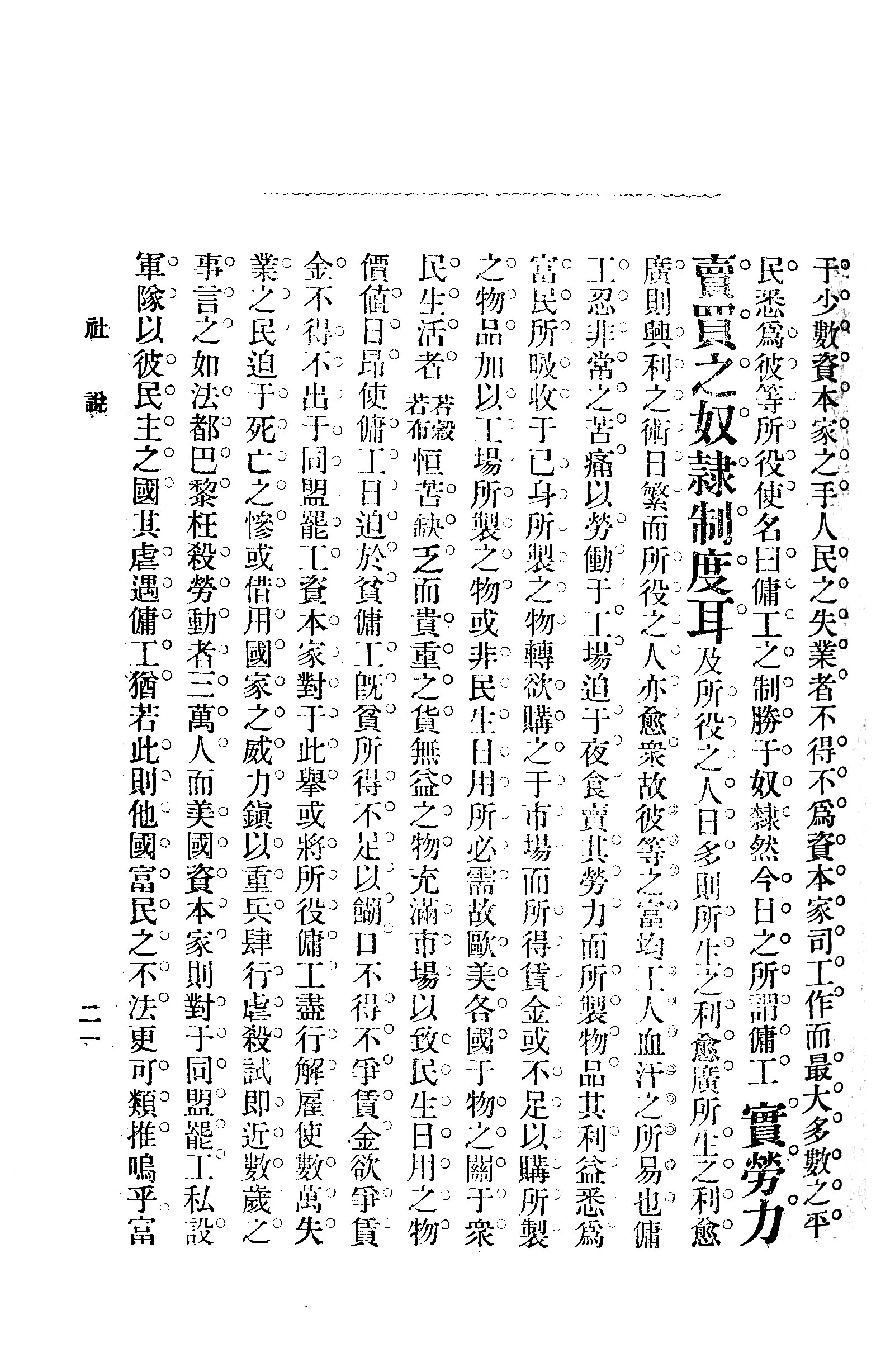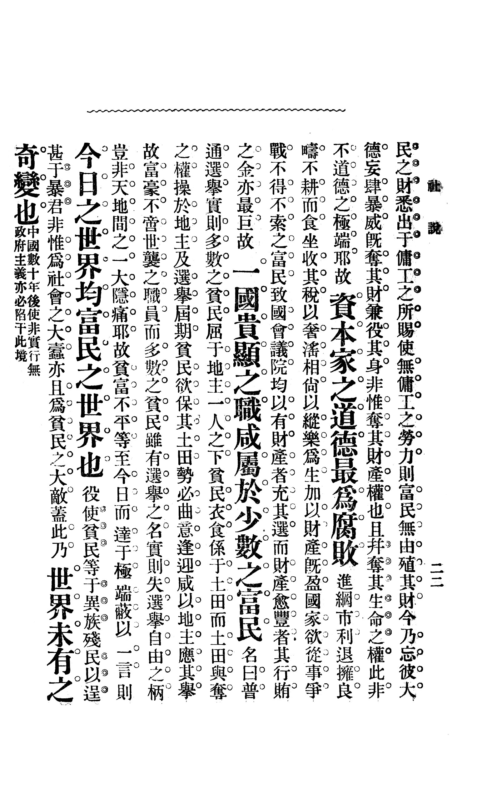 乙、资本家之于佣工。世界自古及今,舍阶级社会而外,无只享权利不尽义务之人,而只享权利不尽义务者,厥惟资本家;亦无只尽义务不享权利之人,而只尽义务不享权利者,厥惟佣工。是则资本家者,兼有昔日贵族、官吏、教士之特权者也;佣工者,兼有昔日平民、奴隶之苦况者也。夫今日之资本家,为人民中最富之人,然彼等之富,岂果由勤勉及节俭而得乎?试溯地主之起源,彼拥富饶之土地,非一己之力所开拓也,亦非以巨金购之他人也。其在欧洲各国,则由昔日战服他族,占其土地为私有,或因有功君主,锡以多数之土田。其在美、澳各洲,又由殖民之初,斥逐蛮民,各占其土田为私产。则今日所谓土地私有者,均强者对弱者之掠夺耳。试更溯富商之起源,大抵无赖黠徒,观时变以射利,利用时机籴贱贩贵,而所获之利,或相倍筛,或相什百,或相千万,故今日之经商致富者,均用欺谲之政策者也。积此二因,而资本家之势成。欧洲社会党有恒言:“彼等之富,均不法掠夺之结果也。”布鲁东亦曰:“彼等所为,直盗贼耳。”足证欧人贱视资本家之心矣。资本家既拥有土地资财,地多则恃以生财,财多则用以购地。然财非己力所能生也,必役使他人以为己用,此佣工所由日多也。然彼所谓佣工者,其始均独立之民也。及富者挟其资产,资以竞利,均较贫民占优胜,故龙