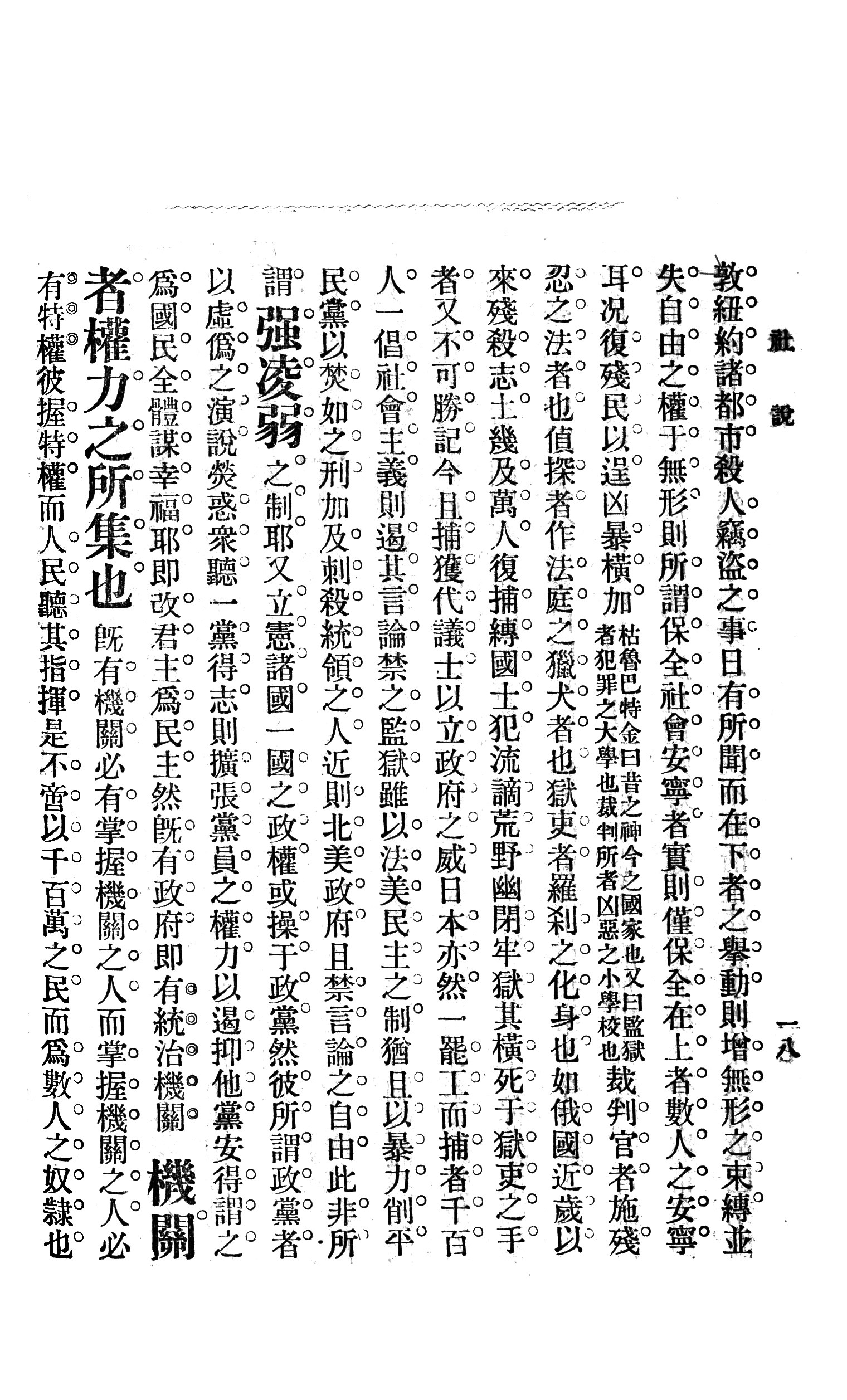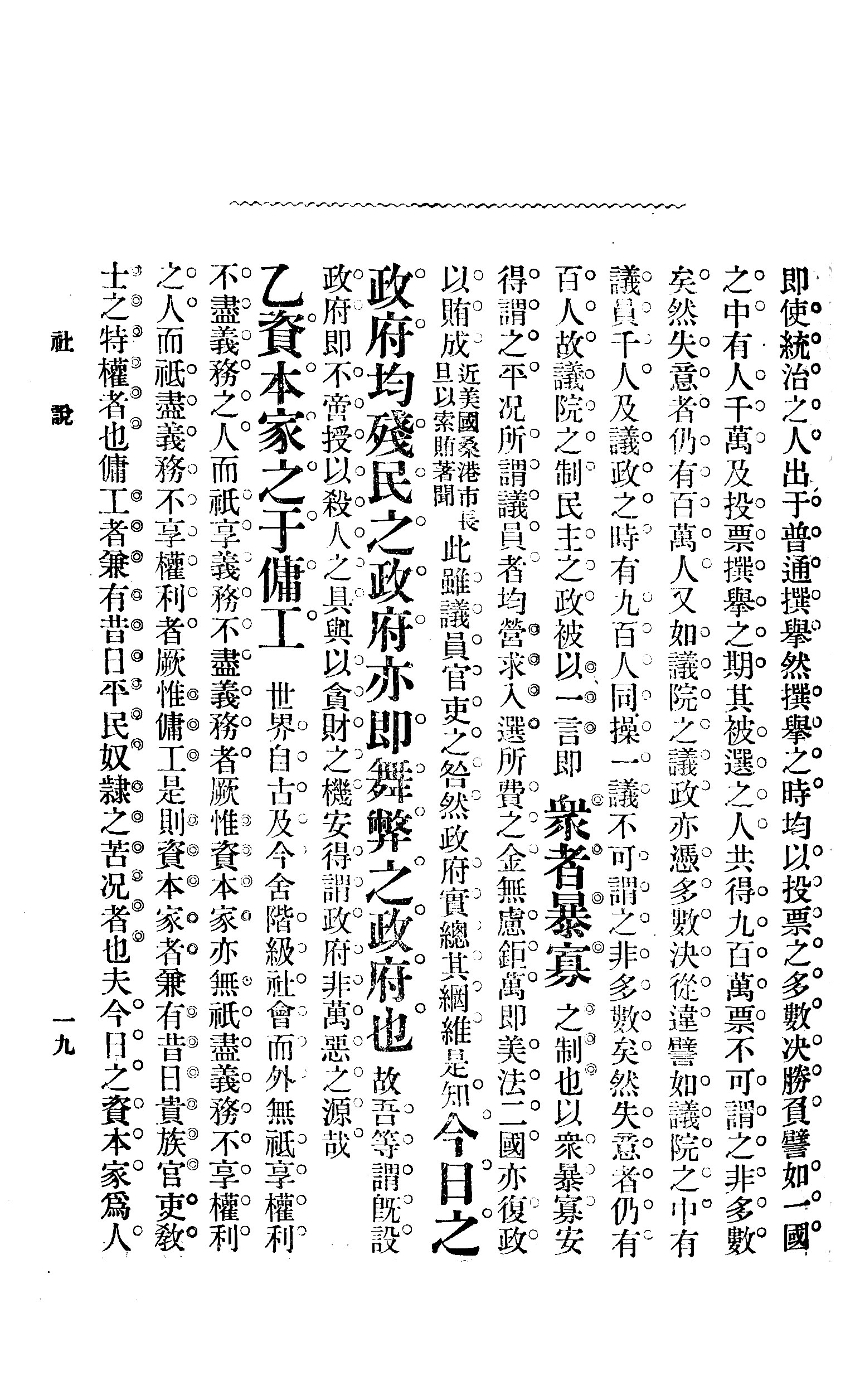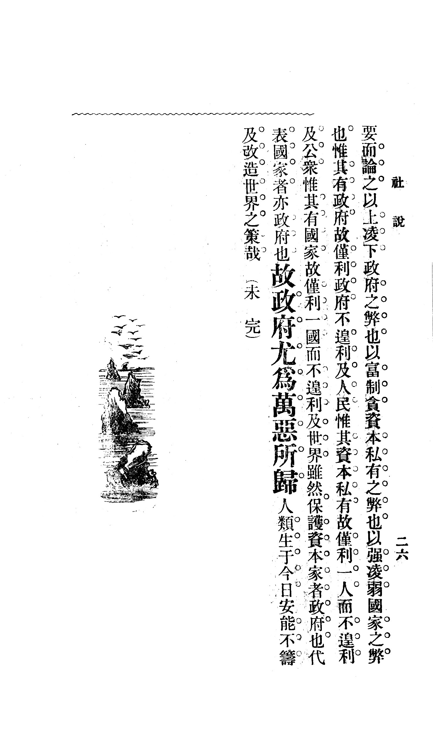 要而论之,以上凌下,政府之弊也;以富制贪,资本私有之弊也;以强凌弱,国家之弊也。惟其有政府,故仅利政府,不遑利及人民。惟其资本私有,故仅利一人,而不遑利及公众。惟其有国家,故仅利一国,而不遑利及世界。虽然,保护资本家者政府也,代表国家者亦政府也,故政府尤为万恶所归。人类生于今日,安能不筹及改造世界之策哉?