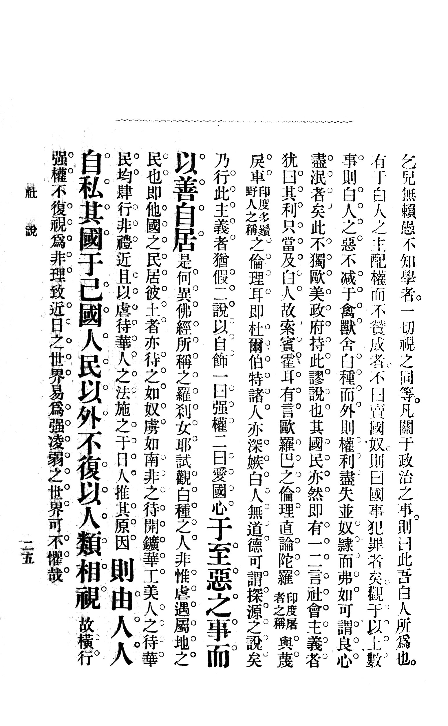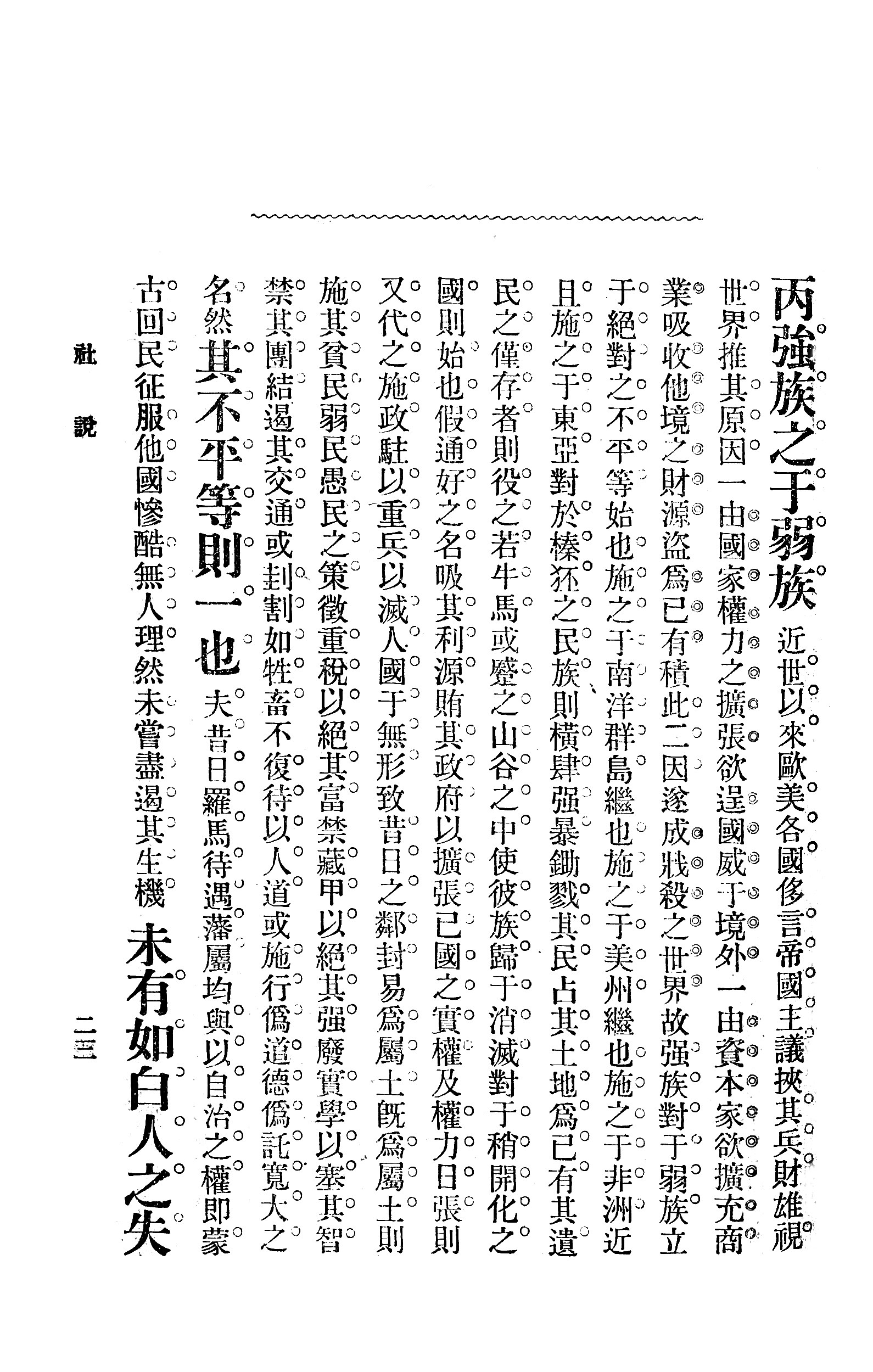丙、强族之于弱族。近世以来,欧美各国,侈言帝国主义,挟其兵财,雄视世界。推其原因,一由国家权力之扩张,欲逞国威于境外;一由资本家欲扩充商业,吸收他境之财源,盗为己有。积此二因,遂成戕杀之世界。故强族对于弱族,立于绝对之不平等。始也施之于南洋群岛,继也施之于美州