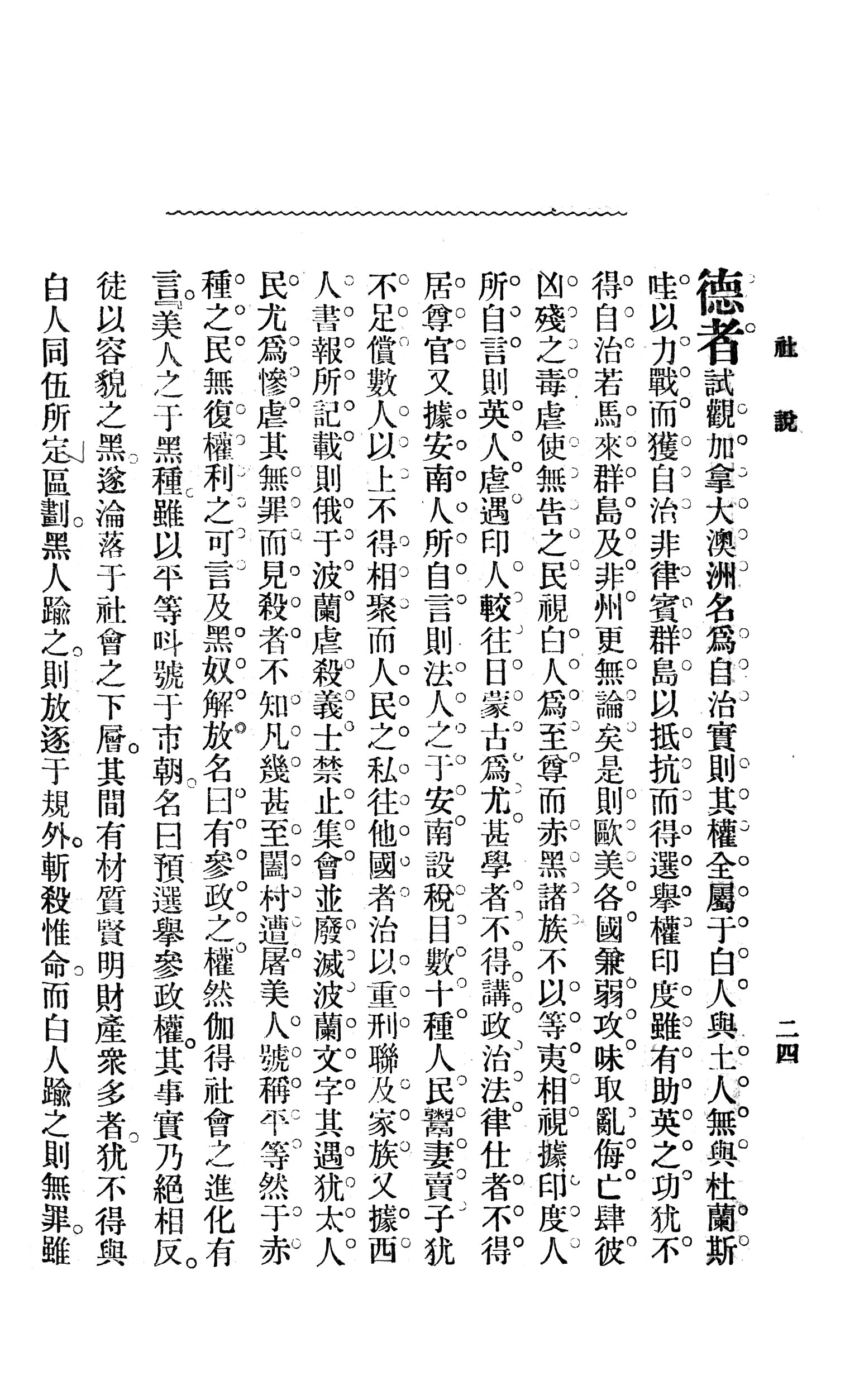 ,继也施之于非洲,近且施之于东亚。对于榛狉之民族,则横肆强暴,锄戮其民,占其土地为己有,其遗民之仅存者,则役之若牛马,或蹙之山谷之中,使彼族归于消灭。对于稍开化之国,则始也假通好之名,吸其利源,贿其政府,以扩张己国之实权,及权力日张,则又代之施政,驻以重兵,以灭人国于无形。致昔日之邻封,易为属土,既为属土,则施其贫民弱民愚民之策,征重税以绝其富,禁藏甲以绝其强,废实学以塞其智,禁其团结,遏其交通,或刲割如牲畜,不复待以人道,或施行伪道德伪托宽大之名,然其不平等则一也。夫昔日罗马待遇藩属,均与以自治之权;即蒙古回民,征服他国,残酷无人理,然未尝尽遏其生机,未有如白人之失德者。试观加拿大、澳洲,名为自治,实则其权全属于白人,与土人无与。杜兰斯哇以力战而获自治,非律宾群岛以抵抗而得选举权,印度虽有助英之功,犹不得自治,若马来群岛及非州,更无论矣。是则欧美各国,兼弱攻昧,取乱侮亡,肆彼凶残之毒,虐使无告之民,视白人为至尊,而赤黑诸族,不以等夷相视。据印度人所自言,则英人虐遇印人较往日蒙古为尤甚,学者不得讲政治法律,仕者不得居尊官。又据安南人所自言,则法人之于安南,设税目数十种,人民鬻妻卖子,犹不足偿,数人以上,不得相聚,而人民之私往他国者,治以重刑,联及家族。又据西人书报所记载,则俄于波兰,虐杀义士,禁止集会,并废灭波兰文字;其遇犹太人民,尤为惨虐,其无罪而见杀者,不知凡几,甚至阖村遭屠。美人号称平等,然于赤种之民,无复权利之可言,及黑奴解放,名曰参政之权,然伽得社会之进化有言:“美人之于黑种,虽以平等叫号于市朝,名曰预选举参政权,其事实乃绝相反,徒以容貌之黑,遂沦落于社会之下层。其间有材质贤明、财产众多者,犹不得与白人同伍,所定区划,黑人逾之,则放逐于规外,斩杀惟命,而白人逾之则无罪,虽乞儿无赖愚不知学者,一切视之同等。凡关于政治之事,则曰此吾白人所为也,有于白人之主配权而不赞成者,不曰卖国奴,则曰国事犯罪者矣。”观于以上数事,则白人之恶,不减于禽兽。舍白种而外,则权利尽失,并奴隶而弗如,可谓良心尽泯者矣。此不独欧美政府持此谬说也,其国民亦然。即有一二言社会主义者,犹曰其利只当及白人。故索宾霍耳有言:欧罗巴之伦理,直论陀罗(印度屠者之称)与蔑戾车(印度多须野人之称)之伦理耳。即杜尔伯特诸人,亦深嫉白人无道德,可谓探源之说矣。乃行此主义者,犹假二说以自饰,一曰强权,二曰爱国心。于至恶之事而以善自居,是何异佛经所称之罗刹女耶?试观白种之人,非惟虐遇属地之民也,即他国之民居彼土者,亦待之如奴虏,如南非之待开矿华工,美人之待华民,均肆行非礼,近且以虐待华人之法,施之于日人。推其原因,则由人人自私其国,于己国人民以外,不复以人类相视,故横行强权,不复视为非理,致近日之世界,易为强凌弱之世界,可不惧哉!