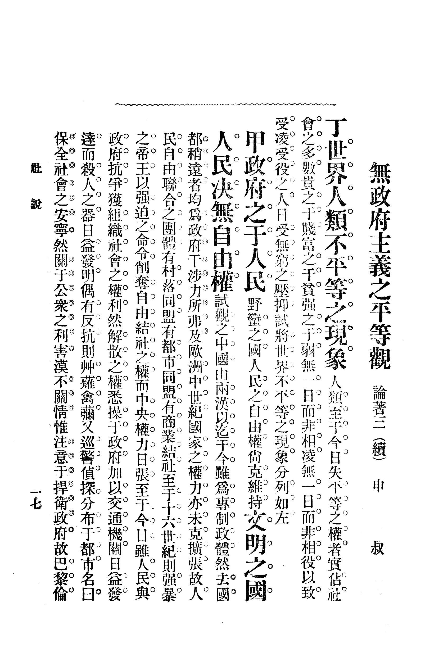甲、政府之于人民。野蛮之国,人民之自由权尚克维持。文明之国,人民决无自由权。试观之中国,由两汉以迄于今,虽为专制政体,然去国都稍远者,均为政府干涉力所弗及。欧洲中世纪,国家之权力亦未克扩张,故人民自由联合之团体,有村落同盟、有都市同盟、有商业结社。至于十六世纪,则强暴之帝王,以强迫之命令,削夺自由结社之权,而中央权力日张。至于今日,虽人民与政府抗争,获组织社会之权利,然解散之权,悉操于政府。加以交通机关,日益发达,而杀人之器,日益发明,偶有反抗,则草剃禽狝。又巡警侦探,分布于都市,名曰保全社会之安宁,然关于公众之利害,漠不关情,惟注意于捍卫政府,故巴黎、伦敦、纽约诸都市,杀人盗窃之事,日有所闻,而在下者之举动,则增无形之束缚,并失自由之权于无形,则所谓保全社会安宁者,实则仅保全在上者数人之安宁耳。况复残民以逞,凶暴横加。(枯鲁巴特金曰:“昔之神,今之国家也。”又曰:“监狱者,犯罪之大学也。裁判所者,凶恶之小学校也。”)裁判官者,施残忍之法者也。侦探者,作法庭之猎犬者也。狱吏者,罗刹之化身也。如俄国近岁以来,残杀志士,几及万人,复捕缚国士犯,流谪荒野,幽闭牢狱,其横死于狱吏之手者,又不可胜记,今且捕获代议士,以立政府之威。日本亦然,一罢工而捕者千百人,一倡社会主义,则遏其言论,禁之监狱,虽以法、美民主之制,犹且以暴力削平民党,以焚如之刑,加及刺杀统领之人,近则北美政府,且禁言论之自由,此非所谓强凌弱之制耶?又立宪诸国,一国之政权,或操于政党,然彼所谓政党者,以虚伪之演说,荧惑众听,一党得志,则扩张党员之权力,以遏抑他党,安得谓之为国民全体谋幸福耶?即改君主为民主,然既有政府,即有统治机关。机关者,权力之所集也。既有机关,必有掌握机关之人,而掌握机关之人必有特权,彼握特权,而人民听其指挥,是不啻以千百万之民,而为数人之奴隶也。即使统治之人,出于普通撰举,然撰举之时,均以投票之多数决胜负,譬如一国之中,有人千万,及投票撰举之期,其被选之人,共得九百万票,不可谓之非多数矣,然失意者仍有百万人。又如议院之议政,亦凭多数决从违,譬如议院之中有议员千人,及议政之时,有九百人同操一议,不可谓之非多数矣,然失意者仍有百人。故议院之制,民主之政,被以一言,即众者暴寡之制也。以众暴寡,安得谓之平?况所谓议员者,均营求入选,所费之金,无虑巨万,即美、法二国,亦复政以贿成(近美国桑港市长旦以索贿著闻),此虽议员官吏之咎,然政府实总其纲维。是知今日之政府,均残民之政府,亦即舞弊之政府也。故吾等谓既设政府,即不啻授以杀人之具,与以贪财之机,安得谓政府非万恶之源哉?
