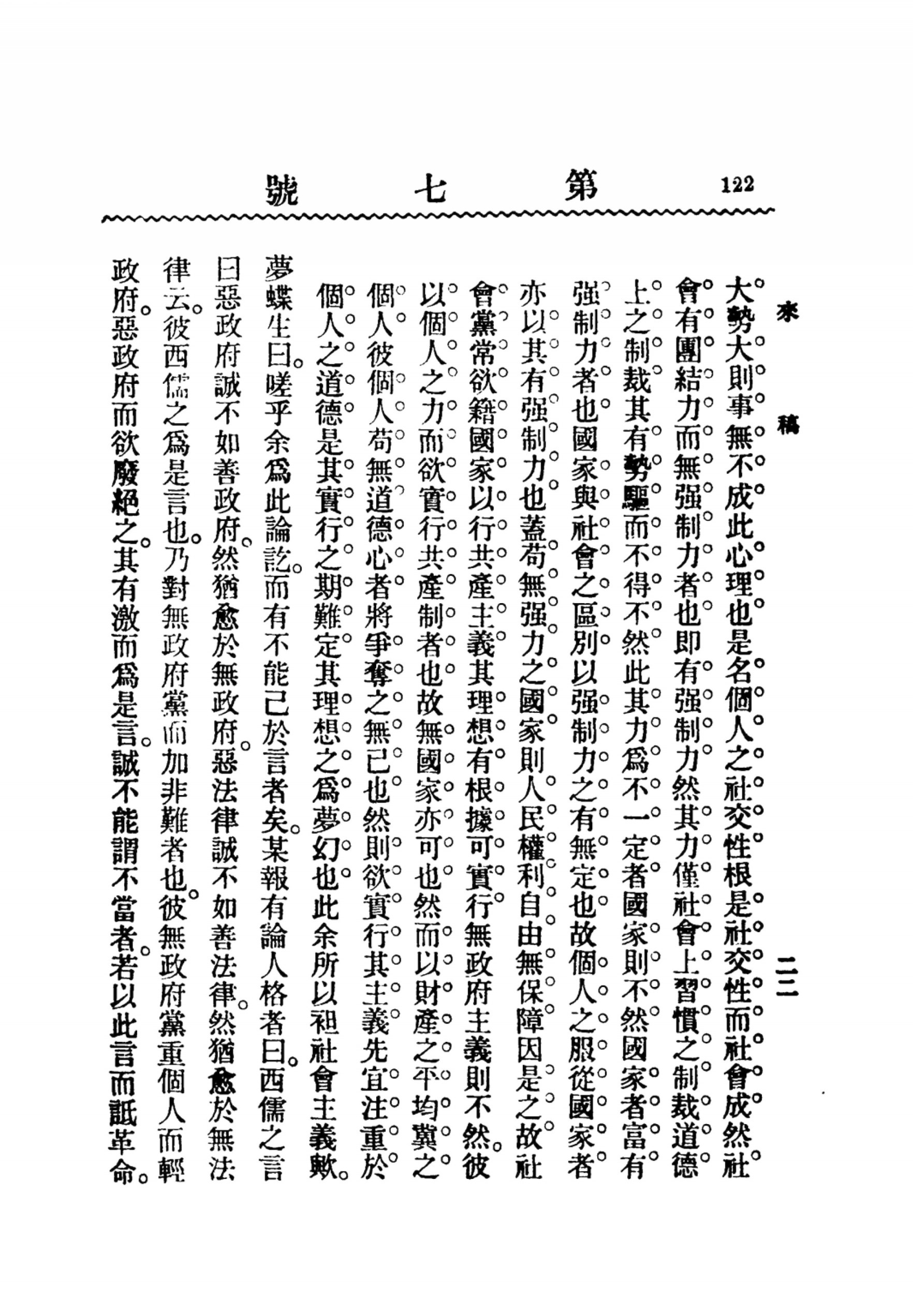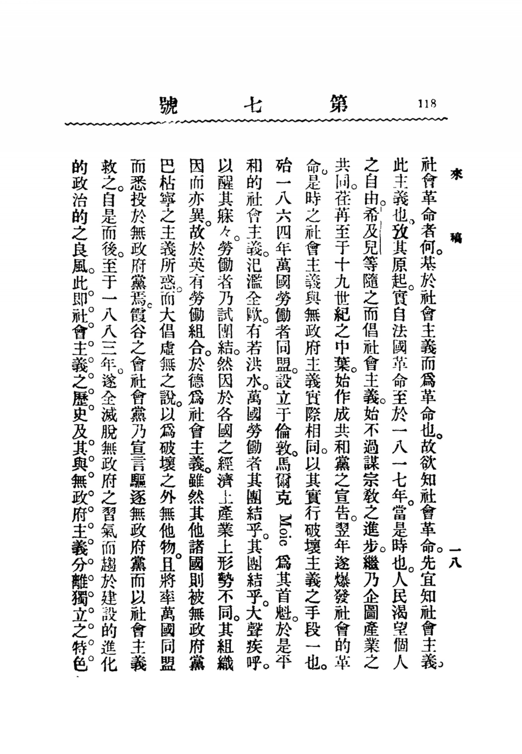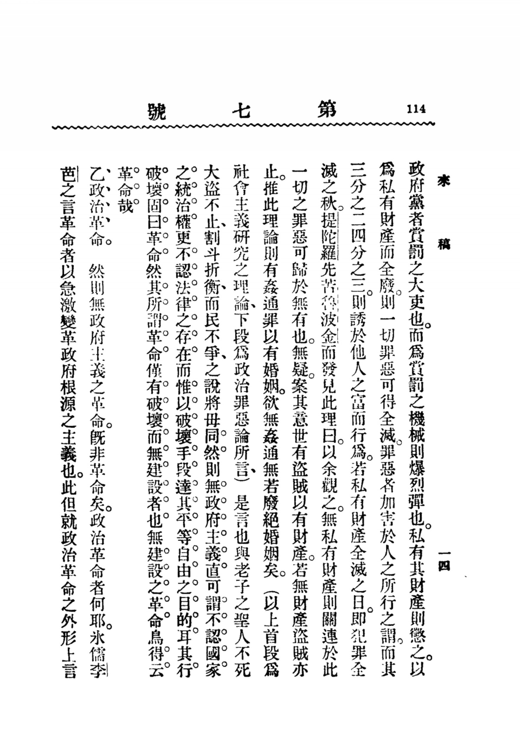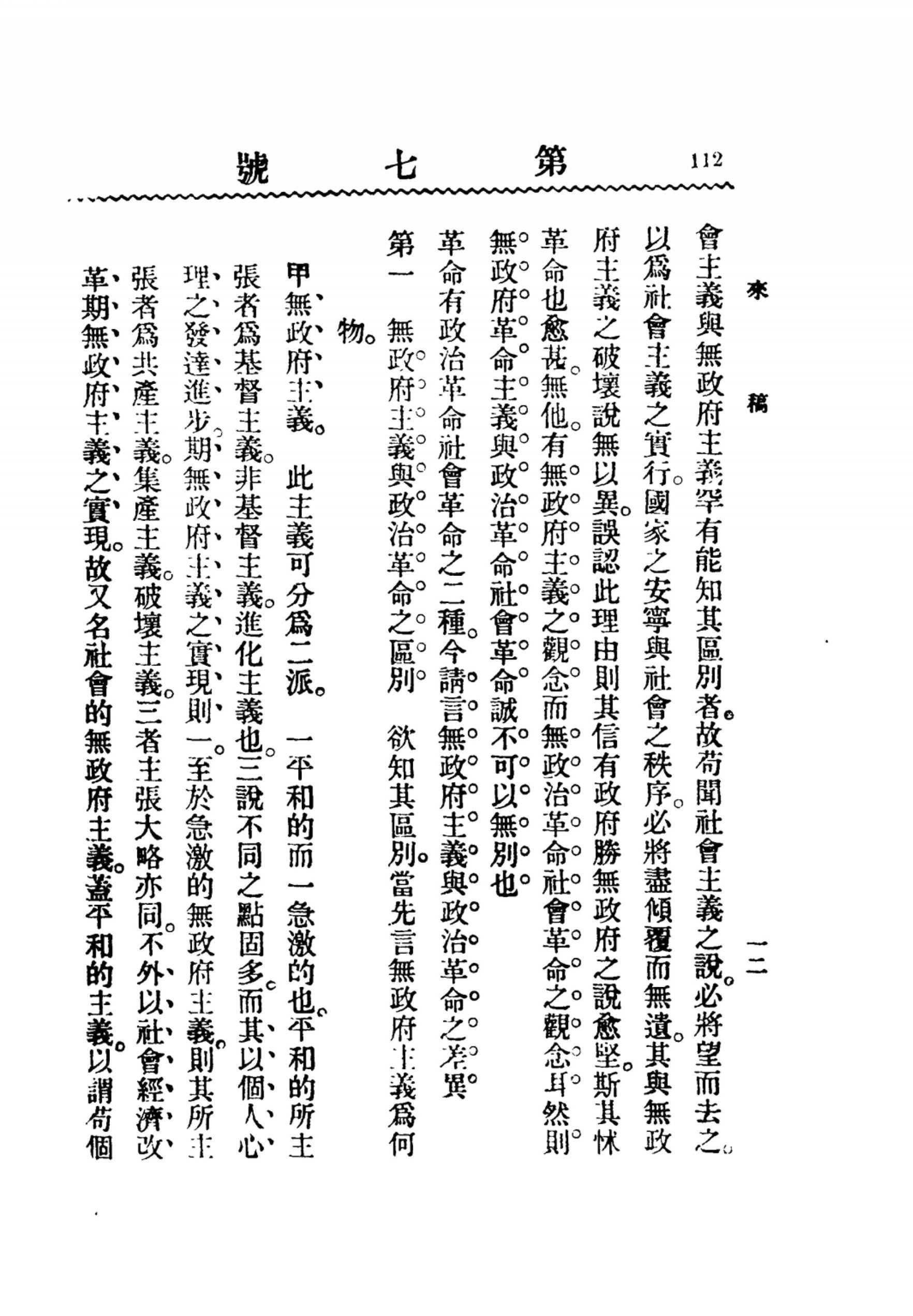 第二,无政府主义与社会革命。无政府主义之性质,前已详言,兹姑不论。